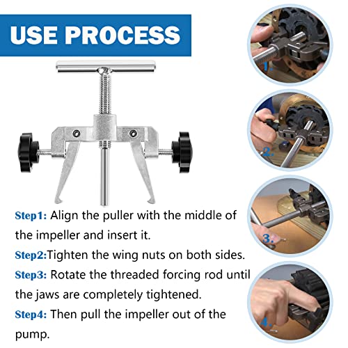 - Efecto: el extractor de impulsor hace que sea más fácil quitar el impulsor flexible de la bomba. Aprieta el mango lateral al cubeta del impulsor y luego gira el tornillo central para sacar el impulsor de la bomba.