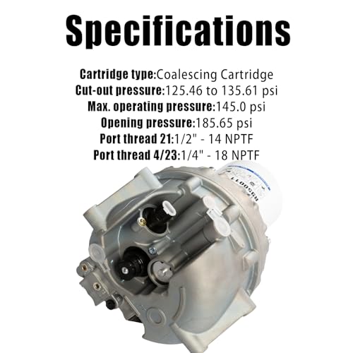 - Especificaciones técnicas: Tipo de cartucho: cartucho coalescente//Presión de corte: 125.46 a 135.61 psi//Max. Presión de funcionamiento: 145.0 psi//Presión de apertura: 185.65 psi//Rosca de puerto 21:1/2" - 14 NPTF//Rosca de puerto 4/23:1/4" - 18 NPTF//Rango de temperatura: -40.0 °F a+176.0 °F//Voltaje: 12 V/Peso: 20.3 lbs (20.28 lbs.)