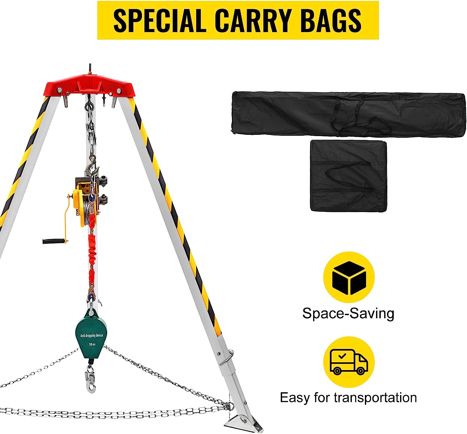 - Múltiples usos: el trípode con cabrestante de rescate es adecuado para la entrada y el rescate en espacios reducidos, como así, alcantarillado, tuberías subterráneas y túneles. Viene con dos bolsas de transporte.