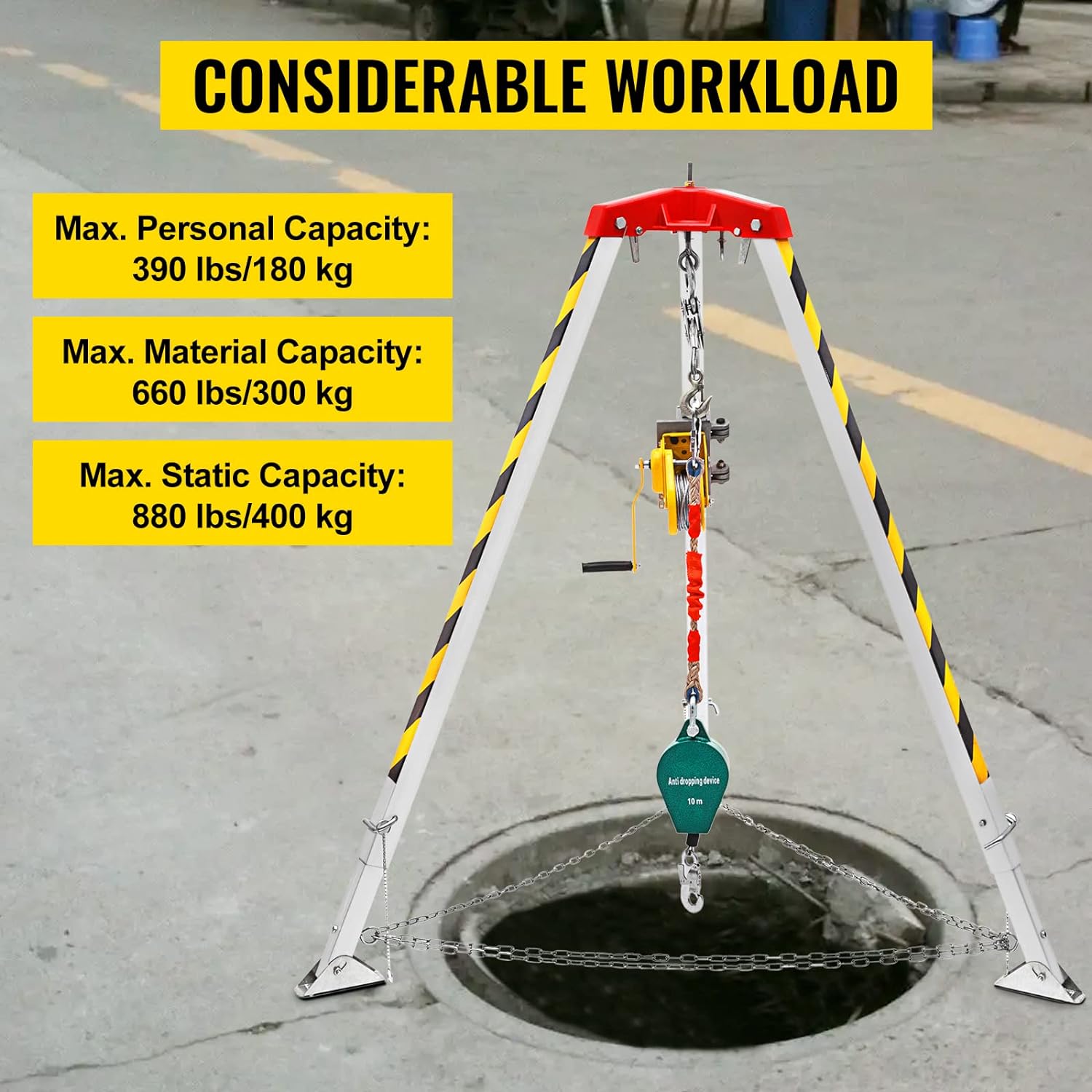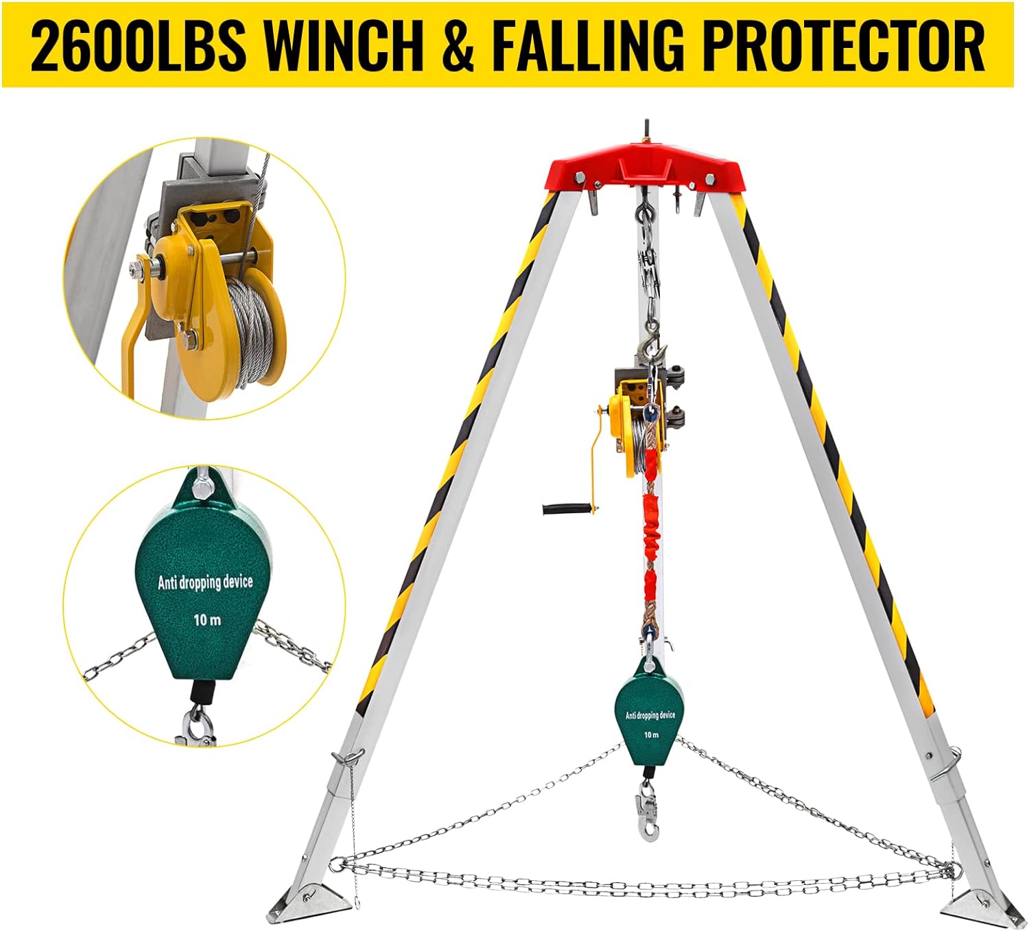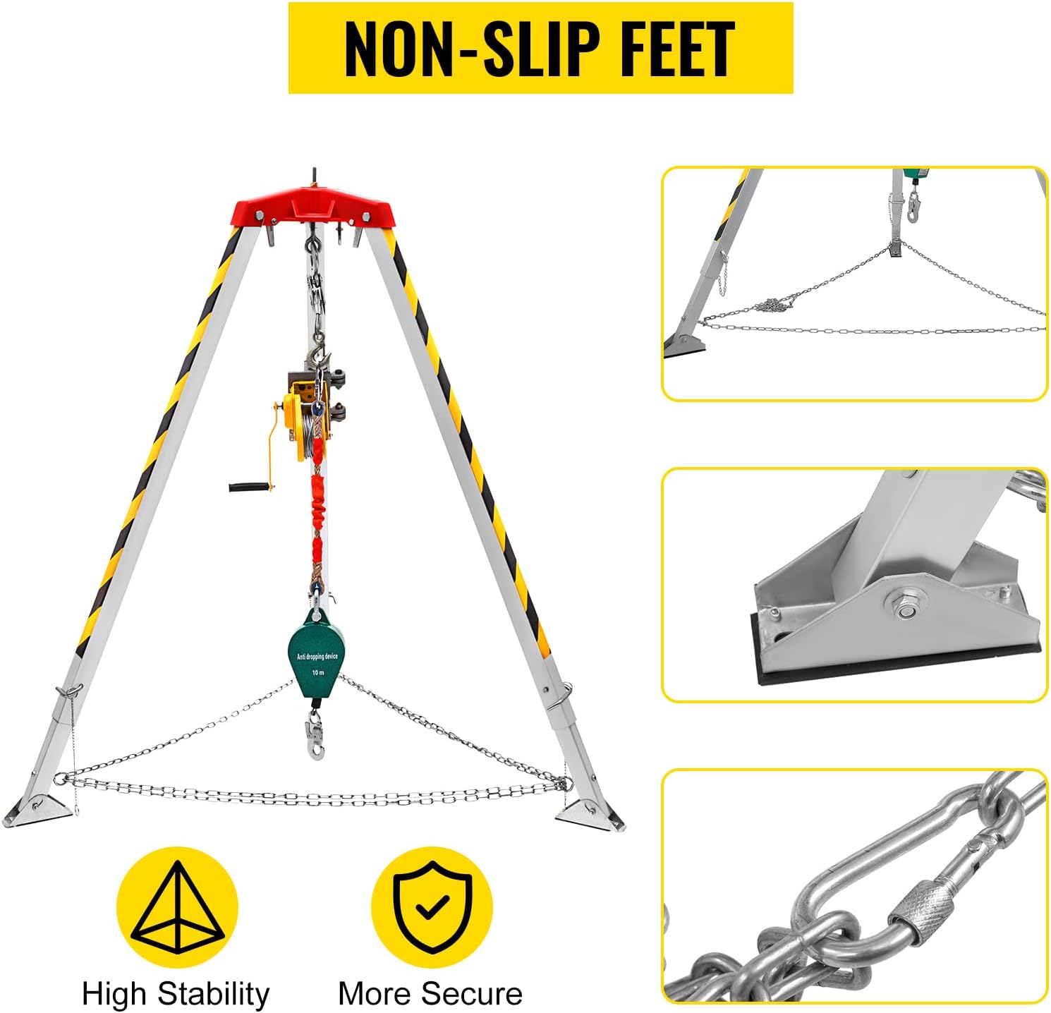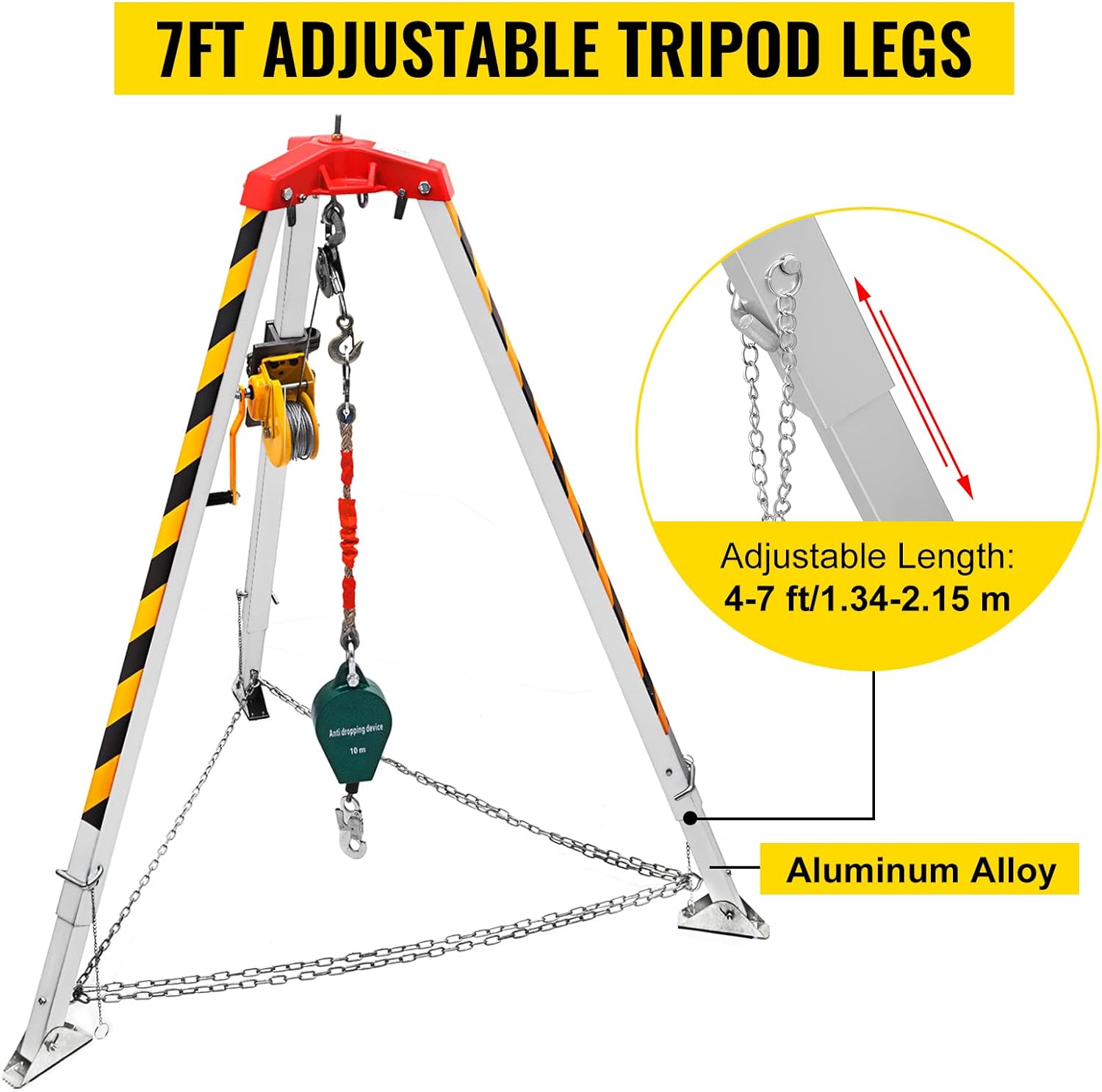 - Patas ajustables de 7.1 ft máx.: las patas de este kit de cabrestante de trípode son de longitud ajustable, de 1,34 a 7.1 ft. Tres pies con almohadillas de goma son ajustables en ángulo y antideslizantes. Se mantiene estable con cadenas de protección de anillo.