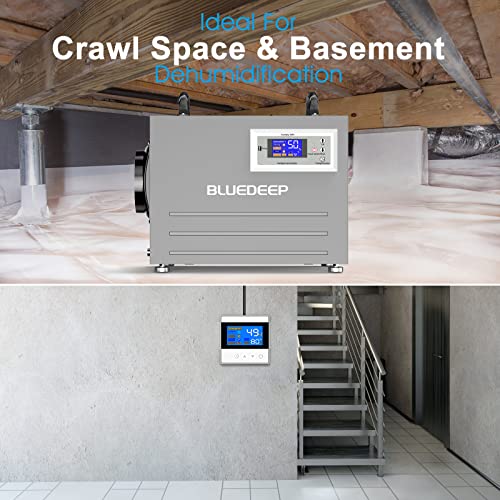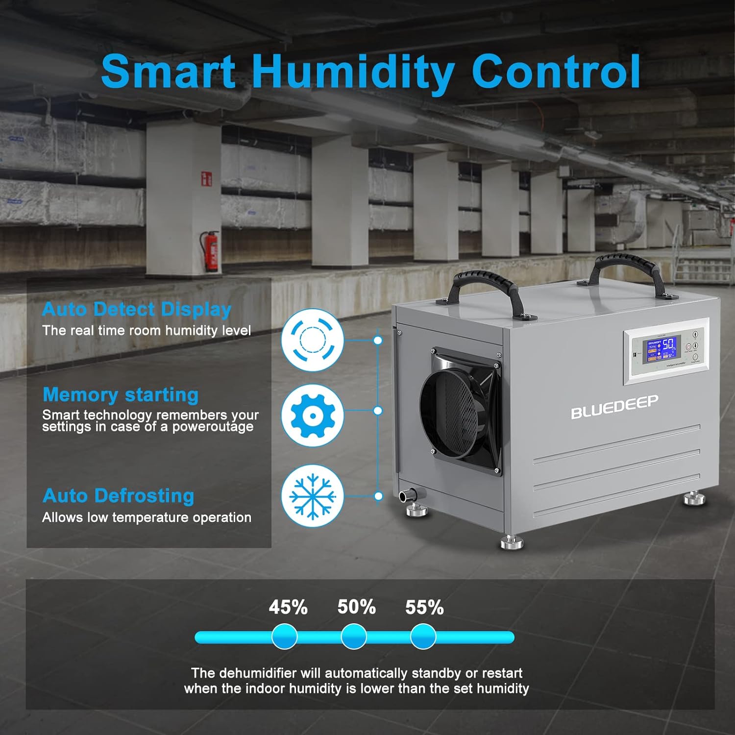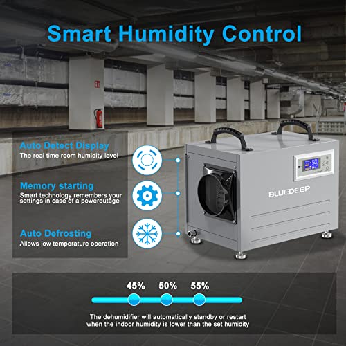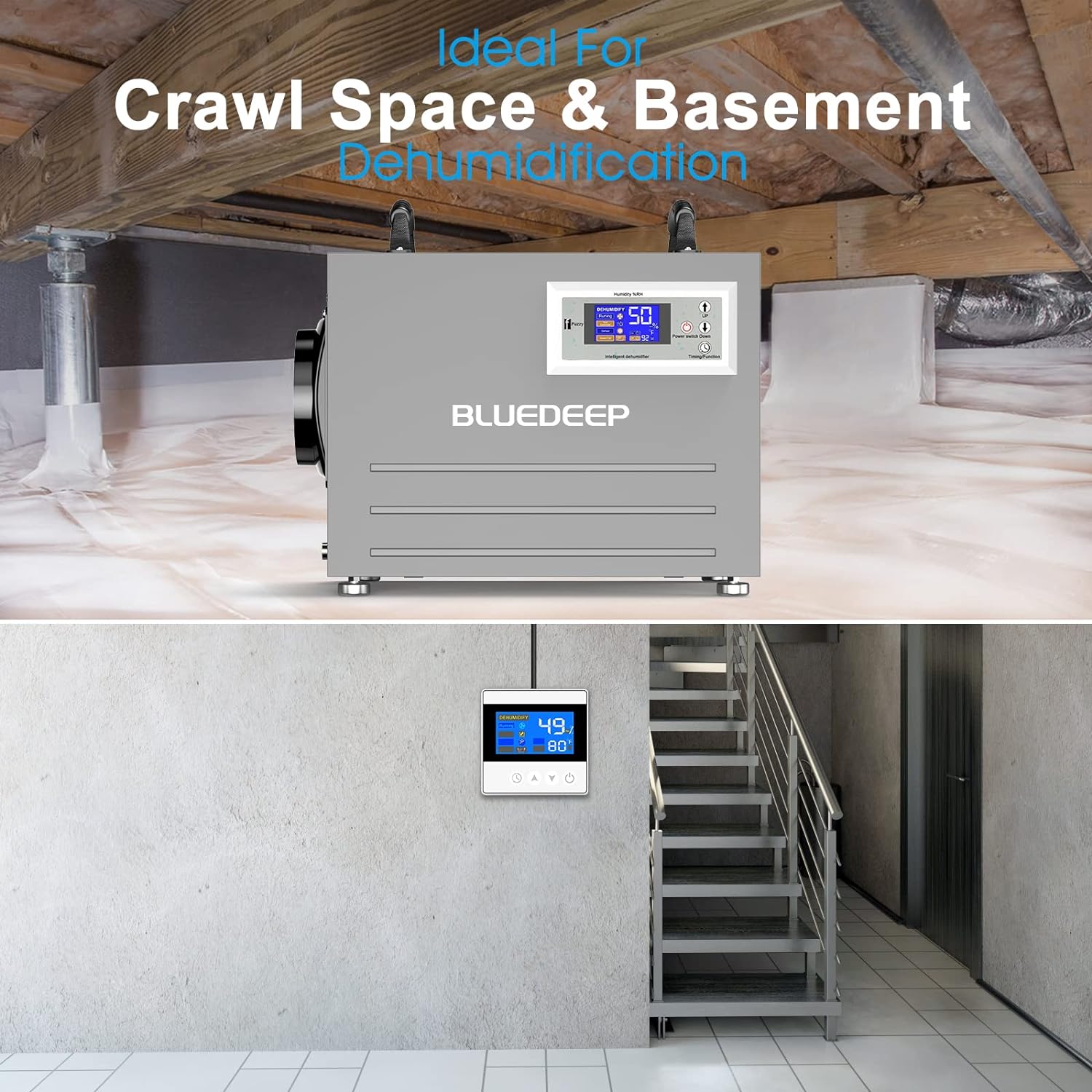 BLUEDEEP - Deshumidificador de espacio para sótano/rastreo, 120 pintas, deshumidificador comercial con manguera de drenaje para almacén, almacenamiento de daños por agua, 1 año de garantía