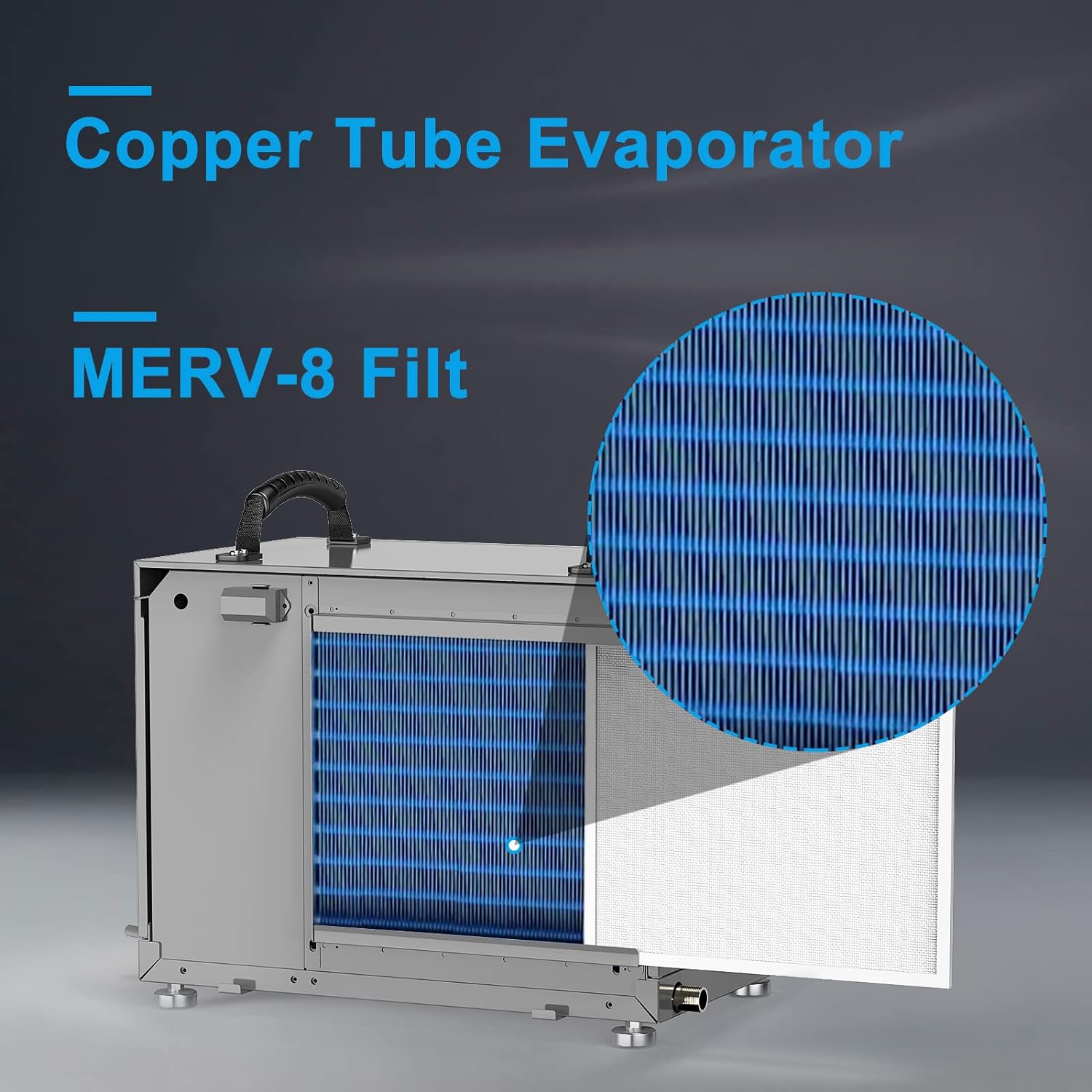 - ✔【Sistema de descongelación automática】 El descongelamiento automático es importante, ya que la acumulación de hielo en las bocinas del deshumidificador puede hacer que las unidades funcionen mal. El deshumidificador comercial BLUEDEEP realmente puede hacer que el deshumidificador de espacios de rastreo pueda funcionar a baja temperatura (7 °F), lo que hace que la unidad funcione de forma continua y eficiente sin detenerse periódicamente durante el proceso de descongelación, no solo también se hace que la unidad dure más tiempo.