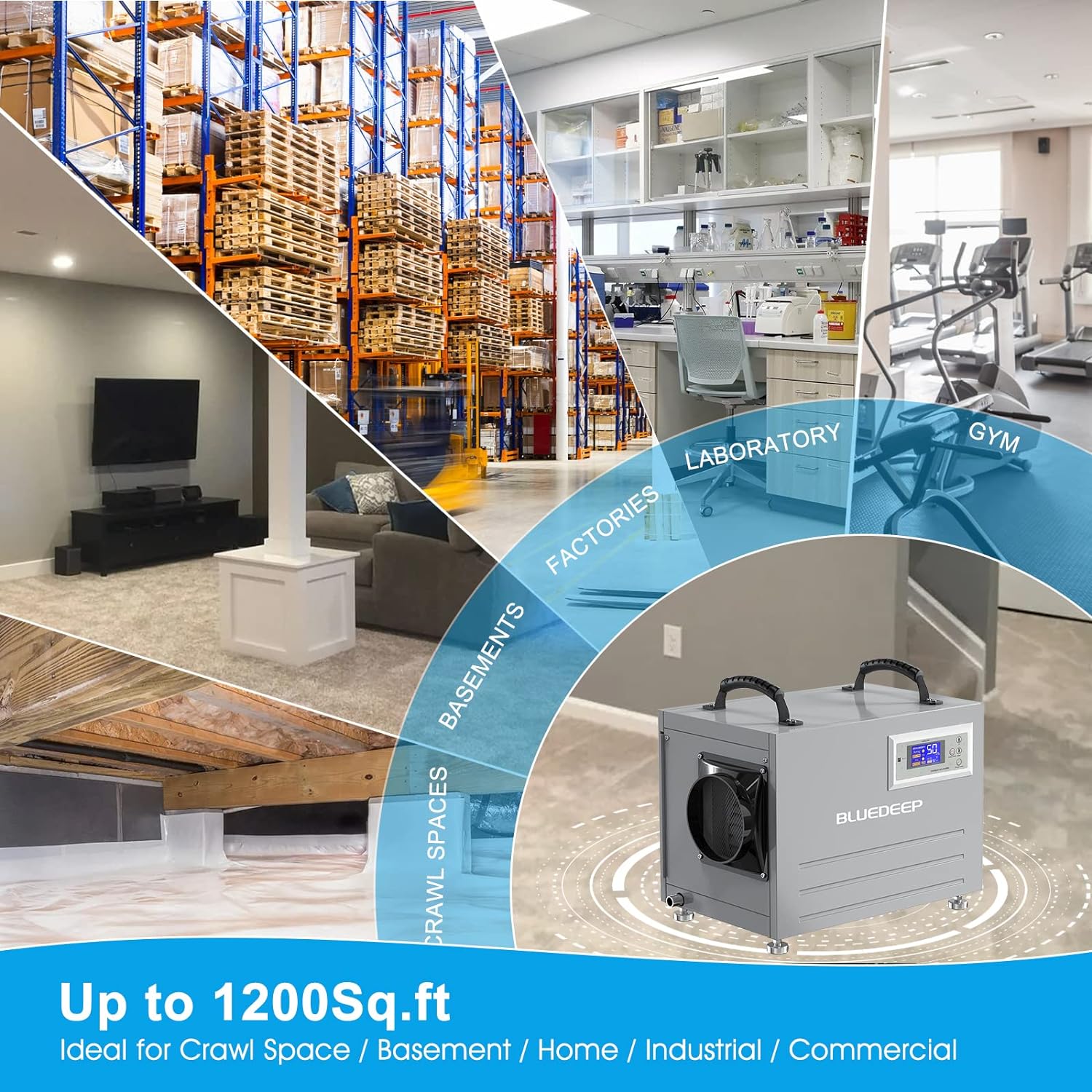 - ✔【Deshumidificador de 110 pines】El deshumidificador comercial BLUEDEEP puede quitar 120 PPD en saturación, 60 pintas por día en AHAM, hasta 1200 sq. Pies, reduciendo la humedad a niveles cómodos en un corto período. Este deshumidificador de sótano está hecho de una carcasa exterior de metal que soporta condiciones más resistentes, asegurando un uso a largo plazo y un fácil mantenimiento. Se adapta a cualquier espacio de rastreo, sótanos, fábricas, laboratorios, almacenes, gimnasios, garajes, lavandería. Puedes mantener un rango de humedad saludable del 45 al 55% fácilmente
