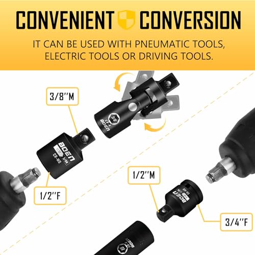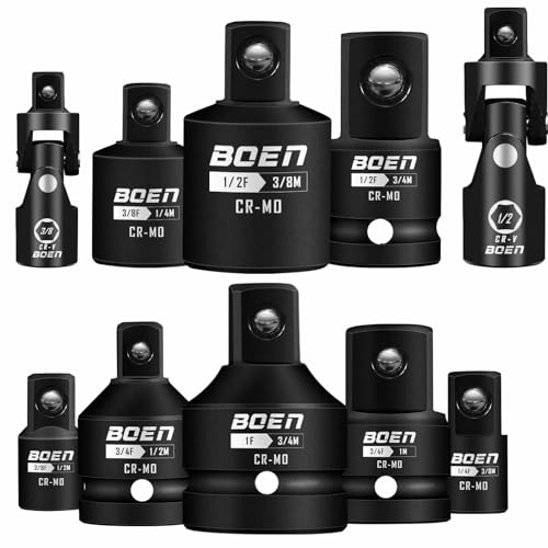 BOEN Juego de adaptador y reductor de llaves de impacto de 10 piezas, SAE estándar de 1/4 pulgadas 3/8 pulgadas 1/2 pulgadas 3/4 pulgadas, kit de conversión de llave y destornillador de acero CR-MO