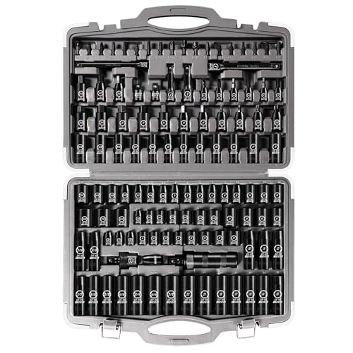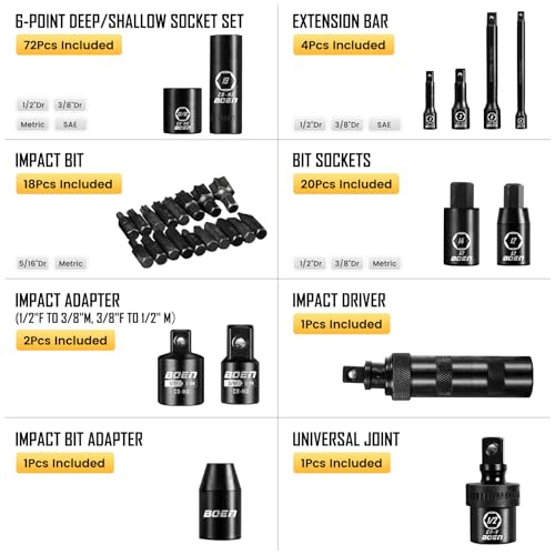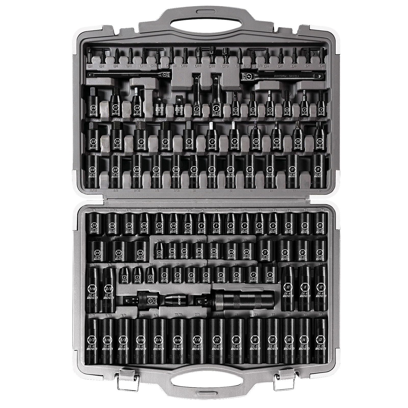 boen Juego de llaves de impacto de 119 piezas, juego de llaves de vaso de 1/2" y 3/8" profundo/poco profundo SAE/métrico, Cr-MO y S2, 6 puntos, broca de impacto, enchufes Allen incluidos