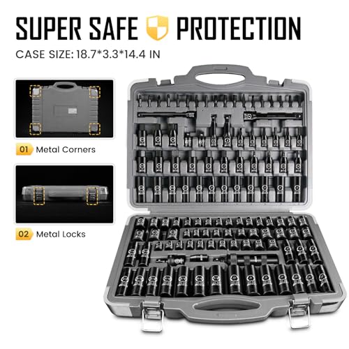 - Mantente organizado y protección de seguridad: la carcasa moldeada por soplado de alta resistencia envuelve firmemente todas las piezas para evitar daños. Carcasa moldeada por soplado con ranura para etiquetas para un fácil almacenamiento y organización del enchufe. El cierre de metal y el diseño de la almohadilla de metal de cuatro esquinas hacen que la funda sea más segura y evita daños por golpes. Un juego de enchufes compelet de 119 piezas satisface las necesidades de toda la familia