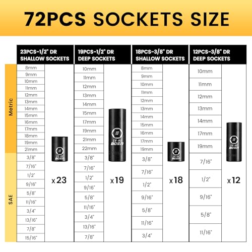 - JUEGO DE ENCHUFE DE POZO PROFUNDO: El juego incluye: 42pcs 1/2 in zócalos, 30pcs 3/8 en zócalos de unidad, 18pcs 5/16 in de la broca de impacto de 1.181 in, 6pcs 3/8 in 47mm zócalos de broca de 1.850 in, 14pcs 1/2 in drive 2.165 in bit socket y otros componentes. Una variedad de tipos de enchufes son adecuados para la reparación de varios tipos de sujetadores en vehículos