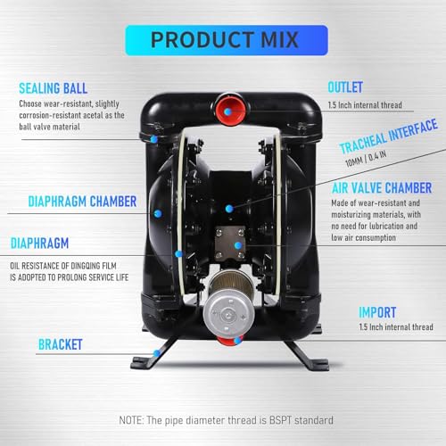 - CÓMO FUNCIONA: bomba de diafragma neumática a potencia de aire comprimido, diafragma instalado en las dos cámaras simétricas de la bomba, la biela central se integrará como un todo junto. El aire comprimido entra en la válvula a través de la entrada de la bomba y se dirige a través del cuerpo de la válvula hacia una cámara para facilitar el movimiento del diafragma mientras que el aire comprimido gas de la otra cámara.