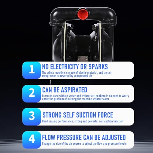 - Ventajas: sin chispa, sin succión de líquido no dañará la bomba, el flujo y la cabeza se pueden ajustar por el tamaño del interruptor de la válvula, la succión se puede ajustar por presión, se puede sumergir en el trabajo medio, se pueden extraer líquidos de alta viscosidad y baja viscosidad.