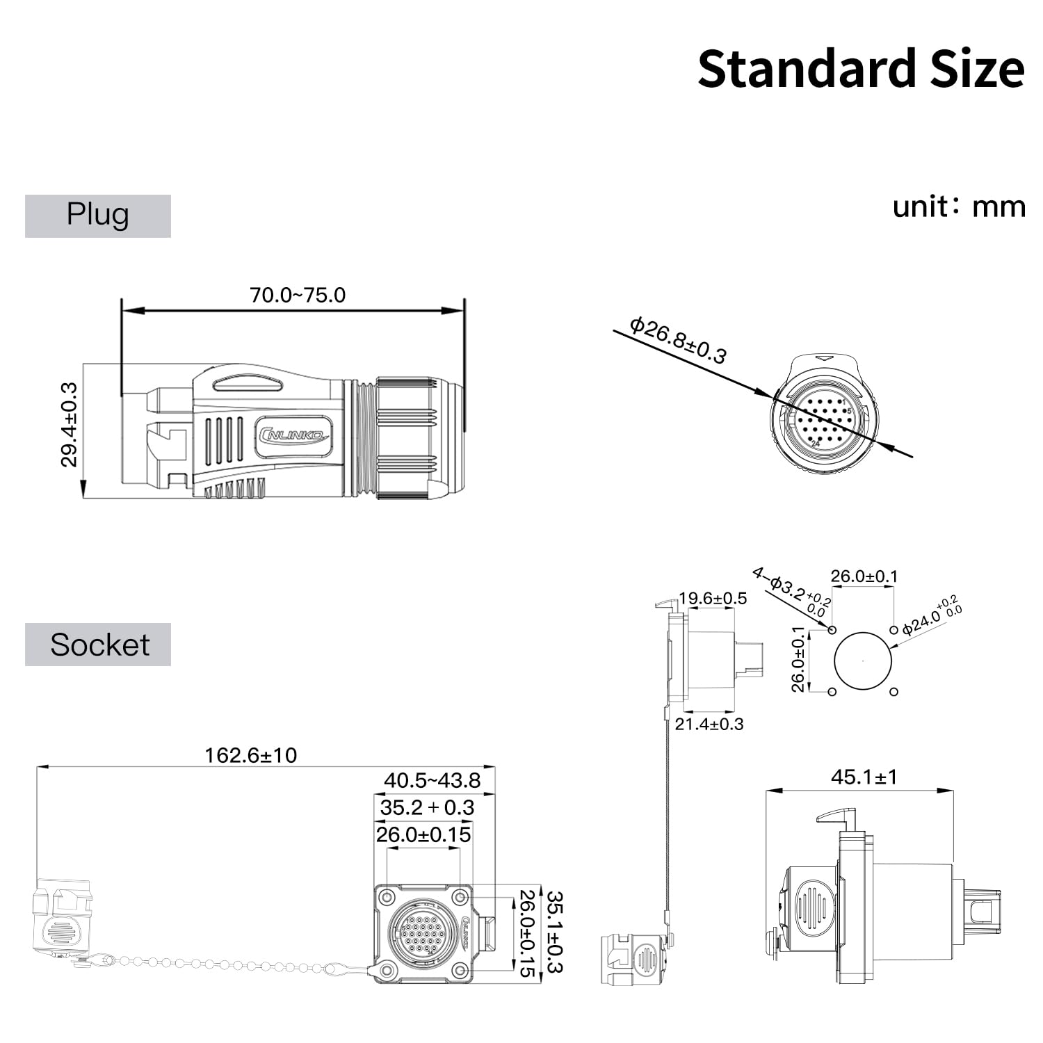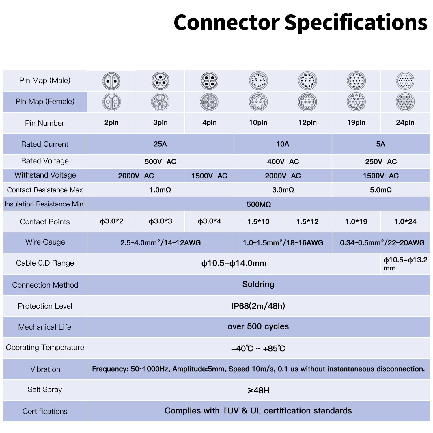 - Especificaciones estándar: Capaz de soportar diámetros de cable de 0,5 mm²/20 AWG uso recomendado ≤ Φ14mm. Diámetro de contacto × Número: Φ1.0x24. Maneja corriente nominal de 5 A, voltaje nominal 250 V CA, soporta voltaje 1000 V CA. La resistencia de contacto es ≤5.0mΩ, la resistencia de aislamiento es> 500MΩ. El conector está diseñado para más de 500 ciclos a temperaturas que van desde -40.0 °F a 185.0 °F. Nota: Evite cargar durante la inserción.