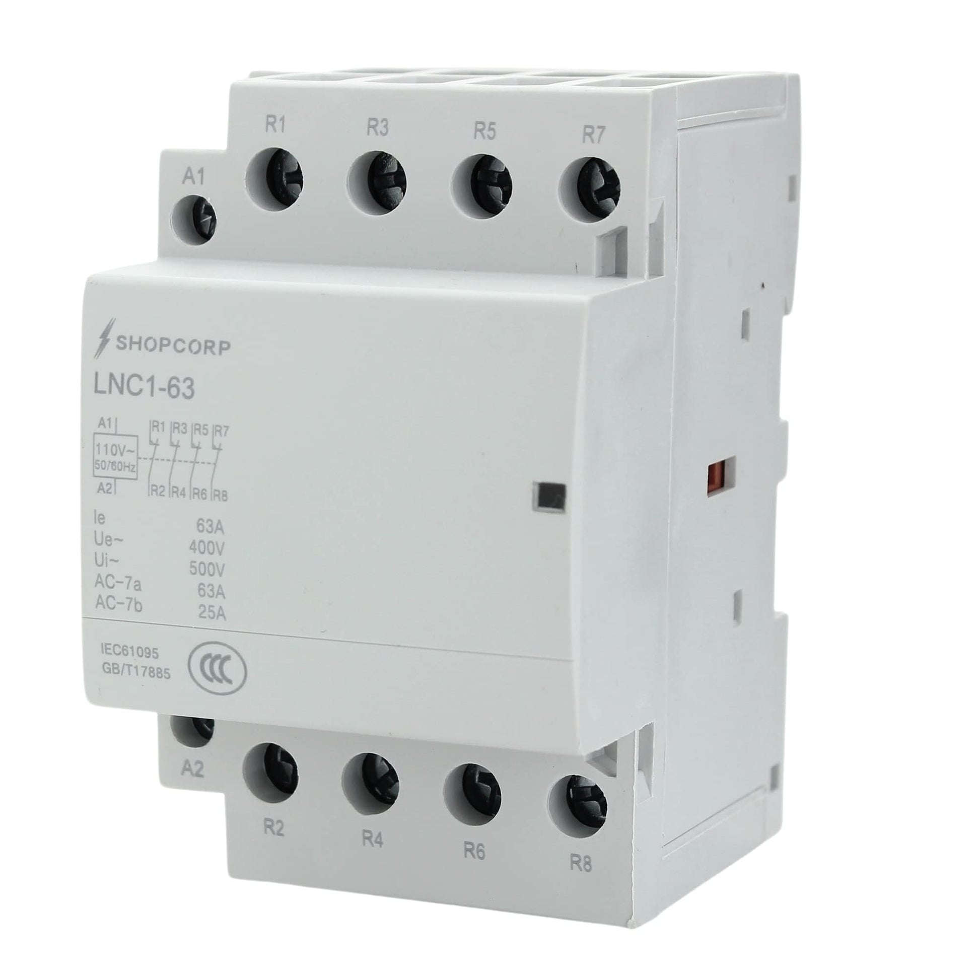 - Componentes de calidad industrial: contactor de iluminación de 63 amperios, 4 polos, normalmente cerrado (NC). Interruptor de contacto de uso general para uso doméstico e industrial con bobina de 110/120 V CA. Contactor de compresor compatible con rieles DIN de 35 mm, con indicador de estado de potencia. Cumple con las normas IEC/EN para una instalación consistente y fiable.