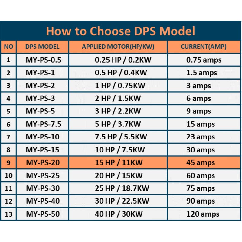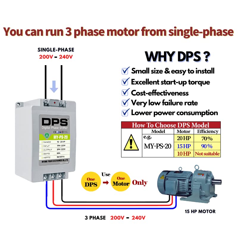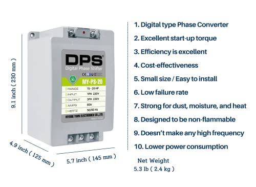 Convertidor monofásico a trifásico, modelo MY-PS-20, adecuado para 15HP (11kw) 45 amperios 200-240V motor trifásico Un DPS tiene que usar solo para un motor, entrada/salida 200V-240V, tipo digital MY-PS-20N