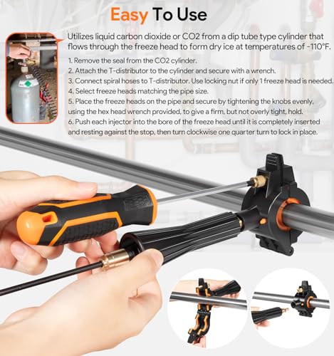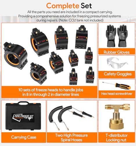 - Conjunto completo: El kit de congelación de tuberías incluye 10 juegos de cabezales de congelación para varios tamaños de tubería, junto con gafas de seguridad, tuerca de bloqueo con distribuidor en T, guantes de goma, dos mangueras en espiral de alta presión con agarres e inyectores, destornillador de cabeza hexagonal, estuche de transporte y todo lo necesario para un sellado por congelación exitoso. Este kit proporciona una solución completa para congelar sistemas presurizados durante las reparaciones. (Nota: el tanque de CO2 no está incluido)