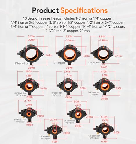 - 10 juegos de cabezales de congelación: hierro de 1/8" o cobre de 1/4", hierro de 1/4" o cobre de 3/8", hierro de 3/8" o cobre de 1/2", hierro de 1/2" o cobre de 3/4", hierro de 3/4" o 1" cobre, 1" hierro o 1-1/4" cobre, 1-1/4" hierro o 1-1/2" cobre, 34/35 EU " hierro o 2" cobre, 2" hierro