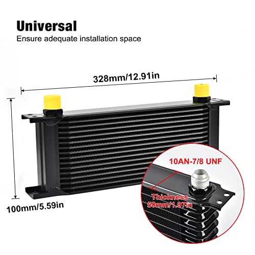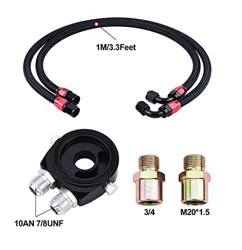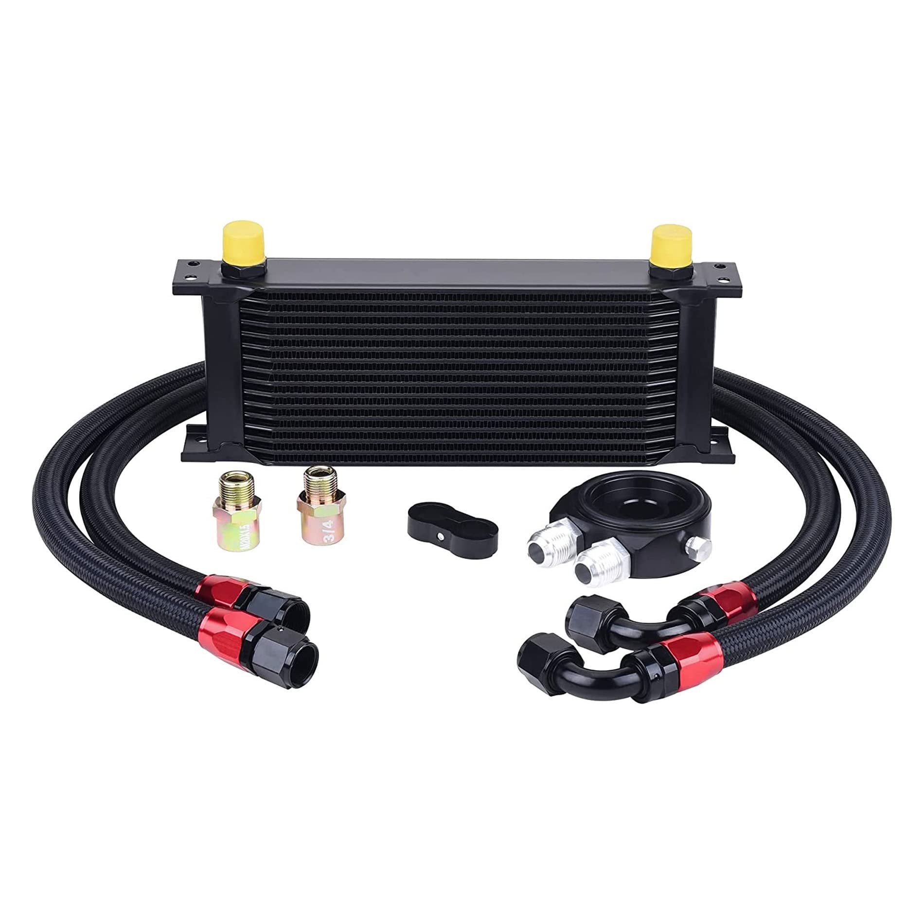 - Tamaño de entrada/salida: 10 A. Capacidad de aceite: 0,39 L. El kit de enfriador de aceite del motor incluye: 1 enfriador de aceite de placa apilada de 16 filas, 2 piezas AN10 trenzado líneas de aceite/combustible (longitudes: 3,94 pies/3.9 ft, 3,28 pies/3.3 ft), 1 adaptador de tuerca de montaje de 3/4, 1 adaptador de tuerca de montaje M20 x 1,5, 1 adaptador de sándwich de filtro de aceite, 1 abrazadera de manguera de combustible. Fabricado con aluminio T-6061 de alta calidad. Se puede utilizar para enfriar el aceite del motor, la transmisión y los diferenciales traseros.