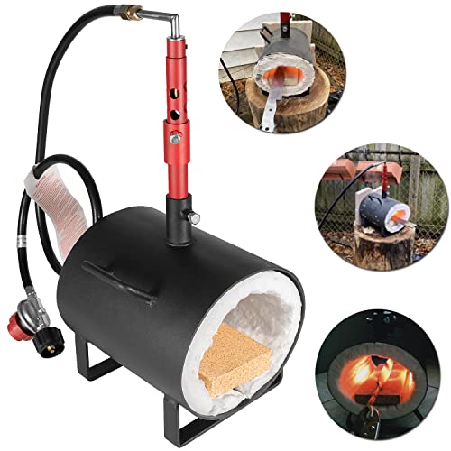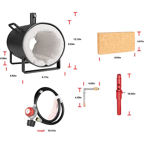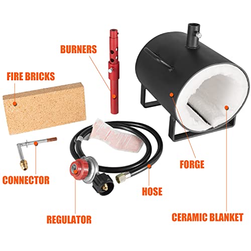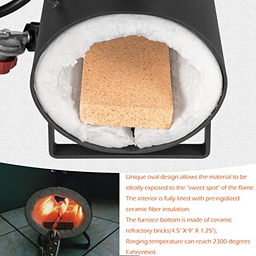 - Capacidad de 2300+F Horno quemador de forja único, el interior está totalmente forrado con manta de cerámica, y los ladrillos refractarios (4.5 x 9 x 1.25 pulgadas) se colocan en la parte inferior del horno, la temperatura de forja puede alcanzar 2500 °F.