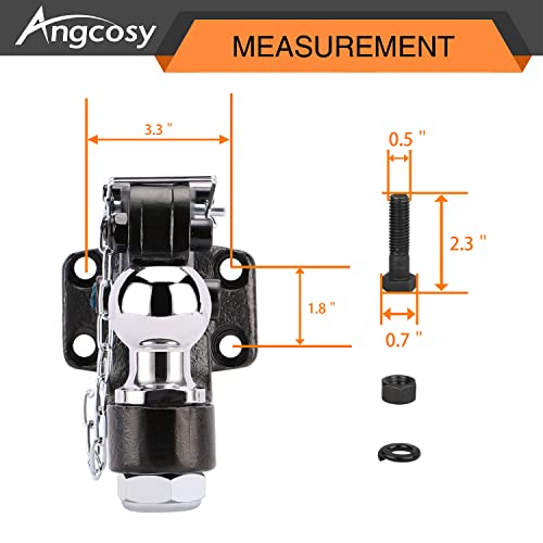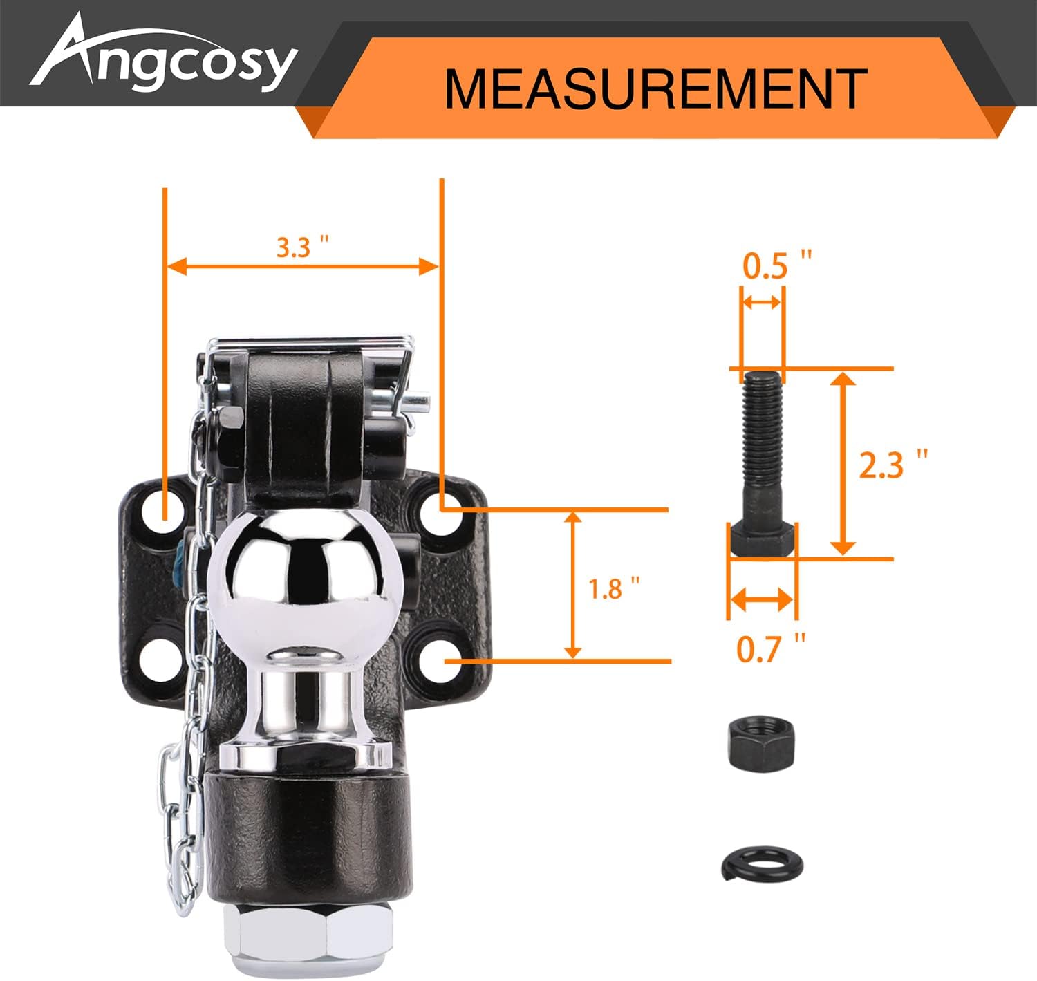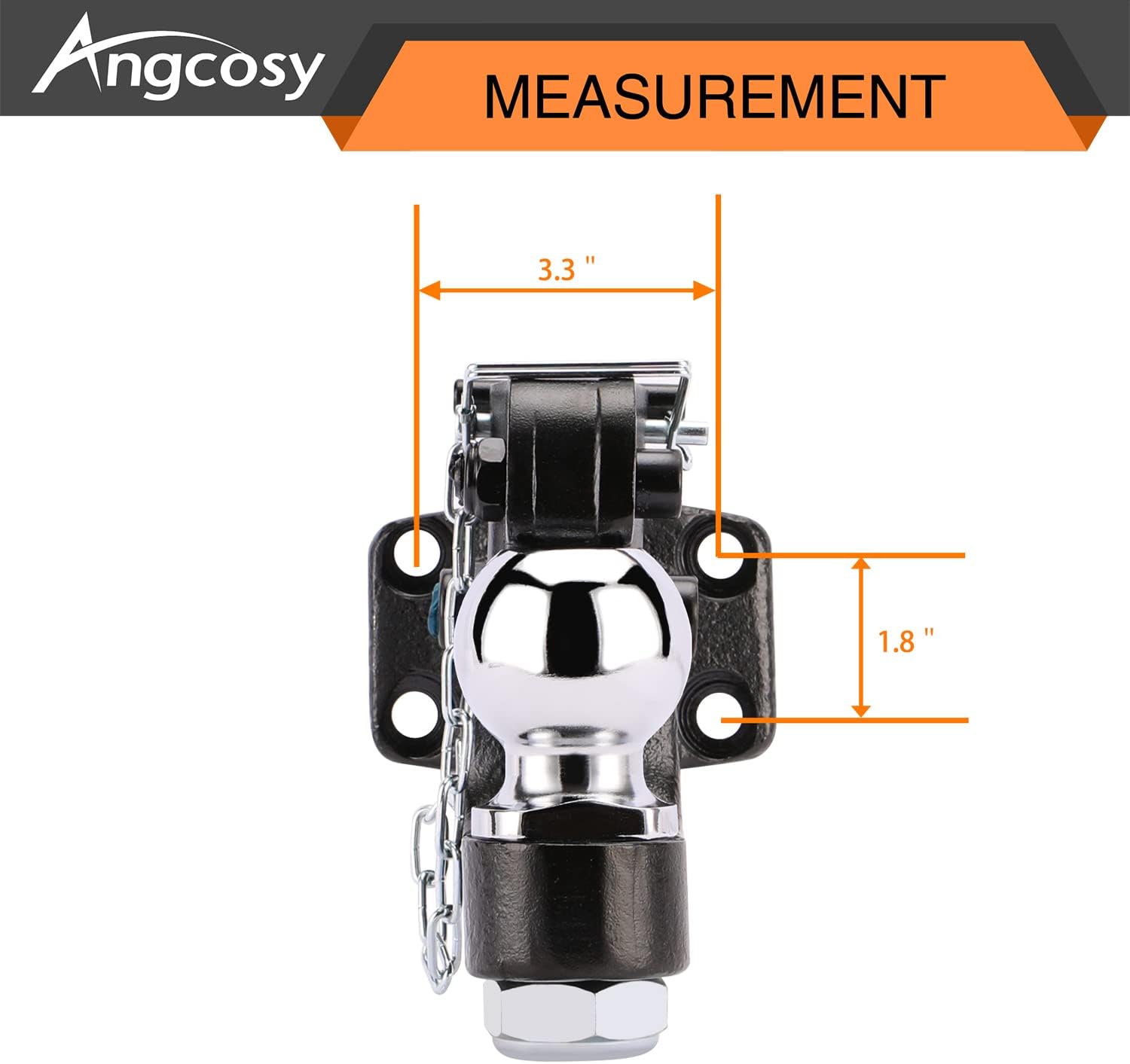 - Medida: el diámetro de la bola de enganche es de 2 pulgadas; el orificio de montaje en la parte posterior completa de la separación una parte en el centro va en dirección horizontal es de 3.35 pulgadas, y la dirección vertical es de 1.77 pulgadas; el diámetro de estos agujeros de montaje es de 1/2 pulgadas;