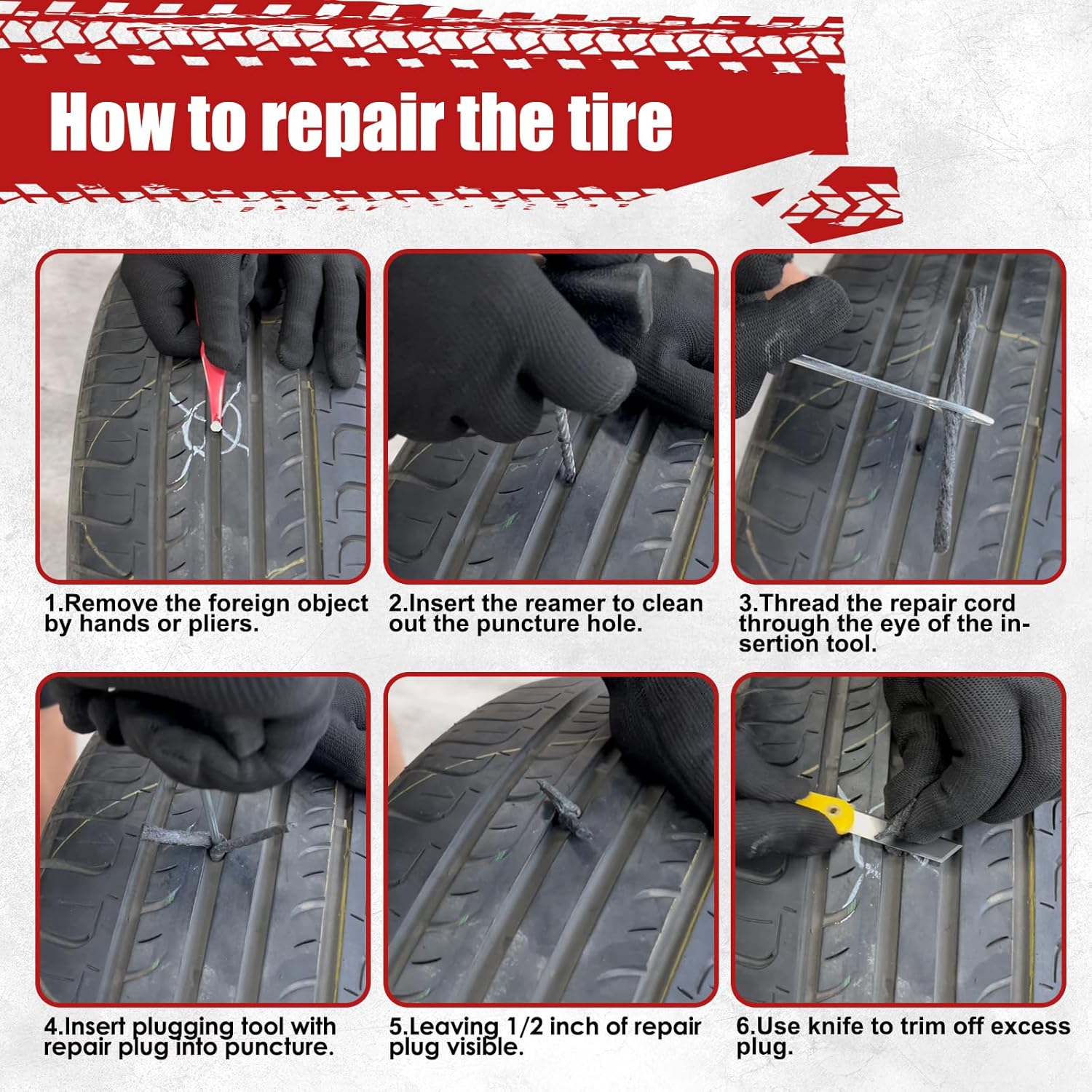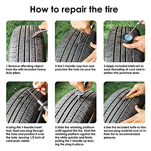 - Nuestro kit de neumáticos está hecho del material de acero más sólido que es más fuerte y no es fácil de romper. Y este kit también equipa un medidor de lápiz que puede medir y mantener el nivel de presión de aire del neumático después del trabajo de reparación de neumáticos para garantizar la seguridad de la conducción