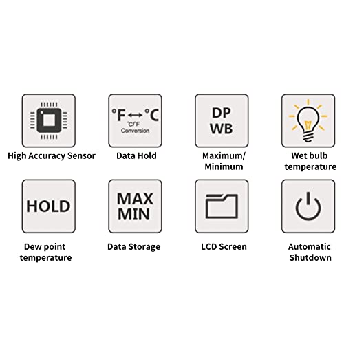 - ✔ [Potente] Este medidor de humedad puede mostrar dos tipos de temperatura, temperatura ambiente, punto de rocío, temperatura del bulbo húmedo, temperatura. Rango de temperatura del bulbo húmedo: 0 a 80 ° C (32 a 176 ° F), Rango de temperatura del punto de rocío: -20 a 80 ° C (-4 a 176 ° F).