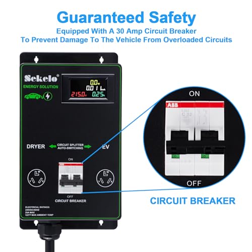 - Integración de carga de vehículos eléctricos sin esfuerzo: el interruptor automático inteligente de Sekelo te permite cargar cómodamente tu vehículo eléctrico desde tu toma de corriente existente de 240 voltios en casa, compartiendo energía sin problemas con tu secadora. No es necesario instalar circuitos adicionales, costosas actualizaciones de paneles o contratar a un electricista. Ahorra dinero y tiempo con una carga más rápida en comparación con una fuente normal de 120 voltios.