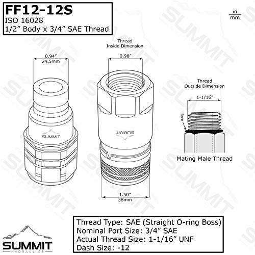 - Rosca SAE de 3/4 pulgadas (1-1/16 "-12 ORB) de 1/2 pulgadas, cuerpo ISO de 1/2 pulgadas, estos acopladores de cara plana intercambian con la mayoría de modelos de cargadores deslizantes, incluyendo compatible con Bobcat, John Deere, Case / New Holland, Kubota, y muchos otros