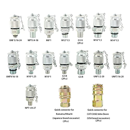 - Acoplamiento de prueba 22: 2xG1/4, 2xG1/8, G3/8, M8*1, M10*1, M10*1.25, M10*1.25, M12*1.5, M14*1.5, M16*1.5, UNF 5/16-24, UNF 7/1/16-24, UNF 7/1/1. 6-20, UNF 1/2-20, UNF 9/16-18, NPT 1/4-18, NPT 1/8-27, R 1/4-19, R 1/8-28, 4xQuick Connector. Son compatibles con Caterpillar, John Deere, Case, Hitachi, Komutsu, Sumitomo, Daewoo, Hyundai, Kato, Kobelco, etc.