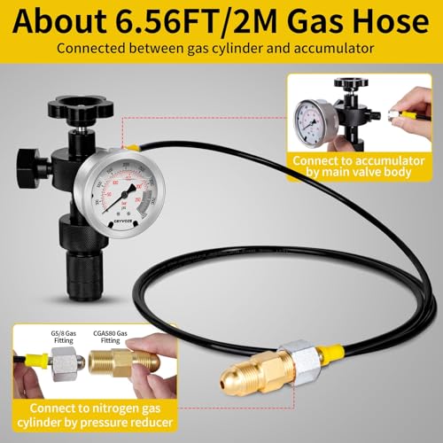 - Diseñado específicamente para acumuladores: Se utiliza para inspeccionar o ajustar la presión de precarga existente en el acumulador o para cargar nitrógeno en el acumulador. 7 adaptadores de acumulador: UNF7/8, UNF5/8, UNF5/16, UNF1/2, G1/4 (BSP1/4), M14* 1.5, M28* 1.5, también con G5/8 macho a adaptador macho CGA580. Adecuado para la medición de presión en la mayoría de las marcas de acumuladores, sistemas de compresión de aire, equipos agrícolas, equipos industriales, etc.
