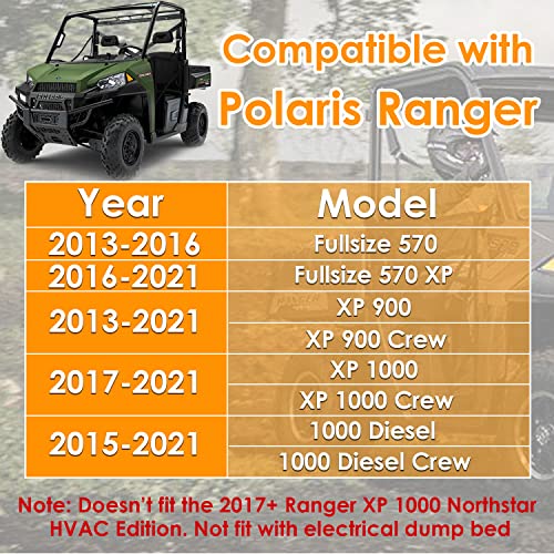 - Compatibilidad: compatible con Polaris Ranger Fullsize 570 2013-2016/Fullsize 570 XP 2016+/XP 900 2013-2021/XP 900 CREW 2013-2021/XP 1000 2017-2021/XP 1000 CREW 201 017-2020 021/1000 Diesel 2015-2021/1000 Diesel CREW 2015-2021 UTV. No es compatible con Ranger XP 1000 Northstar HVAC Edition. No apto para cama de descarga eléctrica.