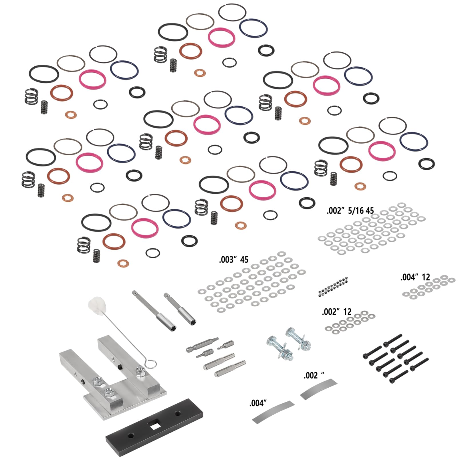 - Un kit completo de reconstrucción de inyectores HEUI: contiene todo lo que necesitas para reparar los 8 inyectores HEUI. El kit incluye kit de cuña de ajuste del inyector (arandelas: 12 x 0.002 pulgadas, cuñas espaciadoras solenoide de acero inoxidable: 45 x 0.2 pulgadas/45 x 0.3 pulgadas), 10 tornillos DPS0010; 2 calibres de sensor (.002 pulgadas/0.4 pulgadas). * Ber, 8 juegos de kit de juntas tóricas internas, 8 juegos de juntas tóricas externas DPS008, 1 abrazadera de aluminio para vicio, 1 soporte, 4 herramientas especiales, 2 soportes magnéticos de 1/4 pulgadas x 3 pulgadas.
