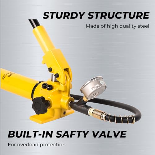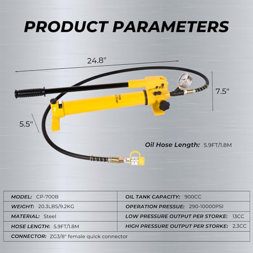 - Potente elevación hidráulica: la bomba de mano hidráulica CP-700B es una opción robusta y fiable para tareas de elevación hidráulica. Con una capacidad de presión máxima de 10000 psi, ofrece la fuerza necesaria para manejar una amplia gama de aplicaciones de elevación con facilidad.