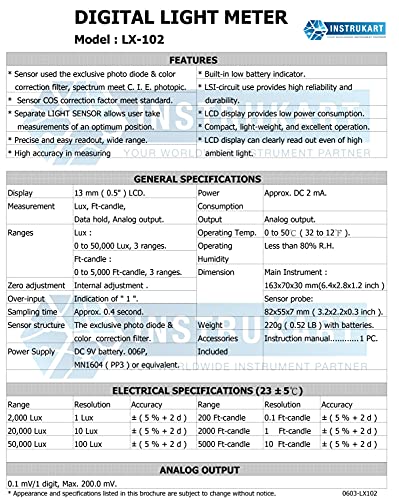 - Características: Alta precisión, precisión, fácil lectura y amplia gama | Exclusivo diodo fotográfico y color, filtro de corrección | Indicador de batería baja integrado | El espectro cumple con C. I. E. fotópico | Factor de corrección COS del sensor | Sensor de luz separado | Uso de circuito LSI proporciona alta fiabilidad y durabilidad