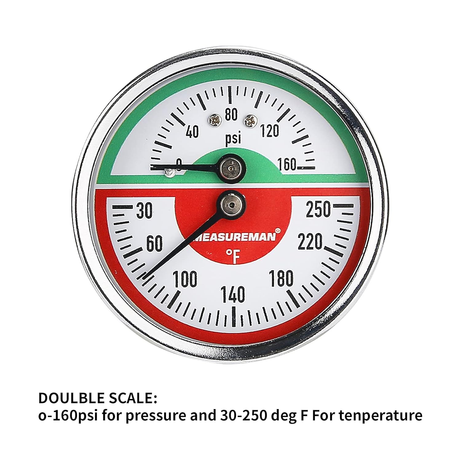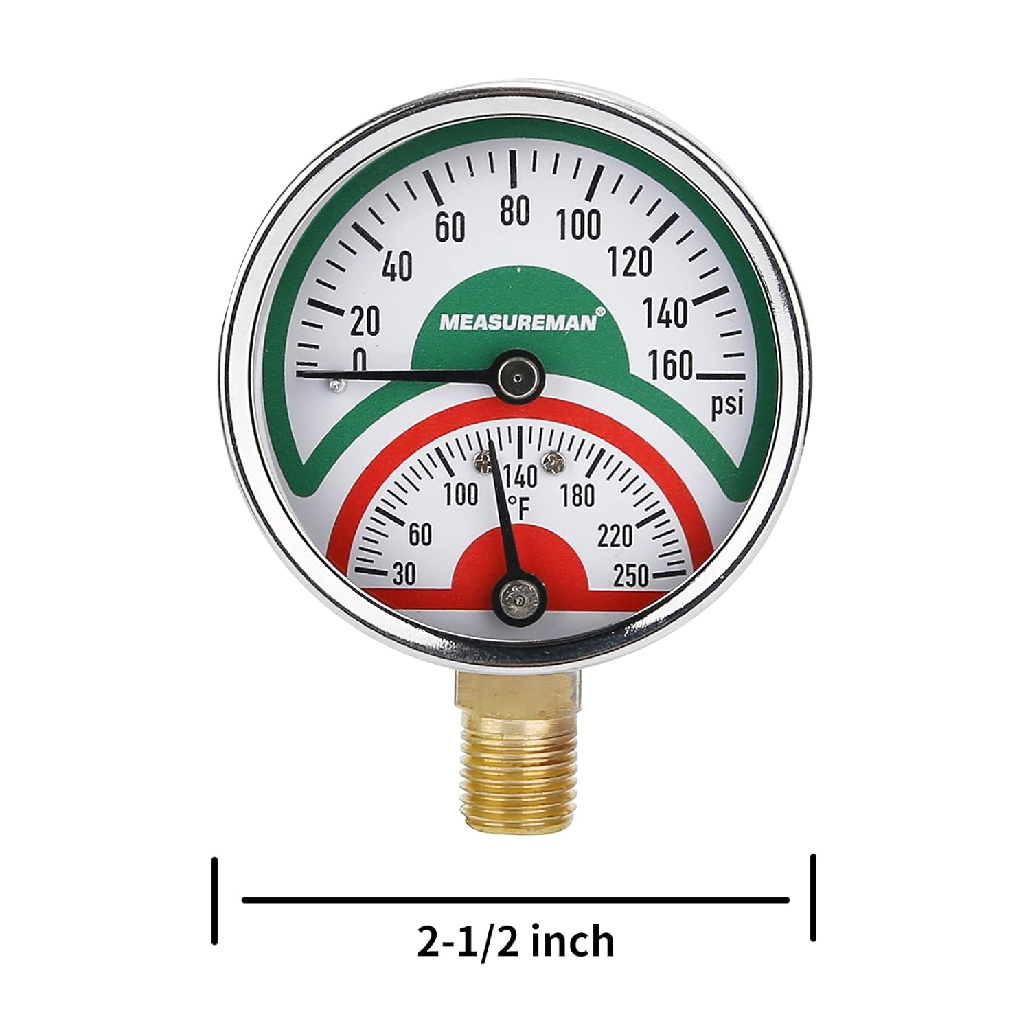Measureman Tridicador, termo-manómetro, 2-1/2 pulgadas, relleno de aceite de silicona, 0-160 psi/30-250 grados F, caja de acero inoxidable, medidor de presión de montaje inferior NPT de 1/4 pulgadas