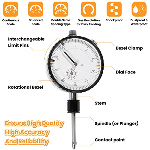 - Material superior: estante de acero inoxidable duro de alta calidad, tallo, eje y punto de contacto, rodamientos con joyas para alta sensibilidad y precisión. Esfera de cristal con revestimiento duro para resistencia a los arañazos con acabado antirreflejo. Impermeable, a prueba de polvo y golpes para una fiabilidad duradera.