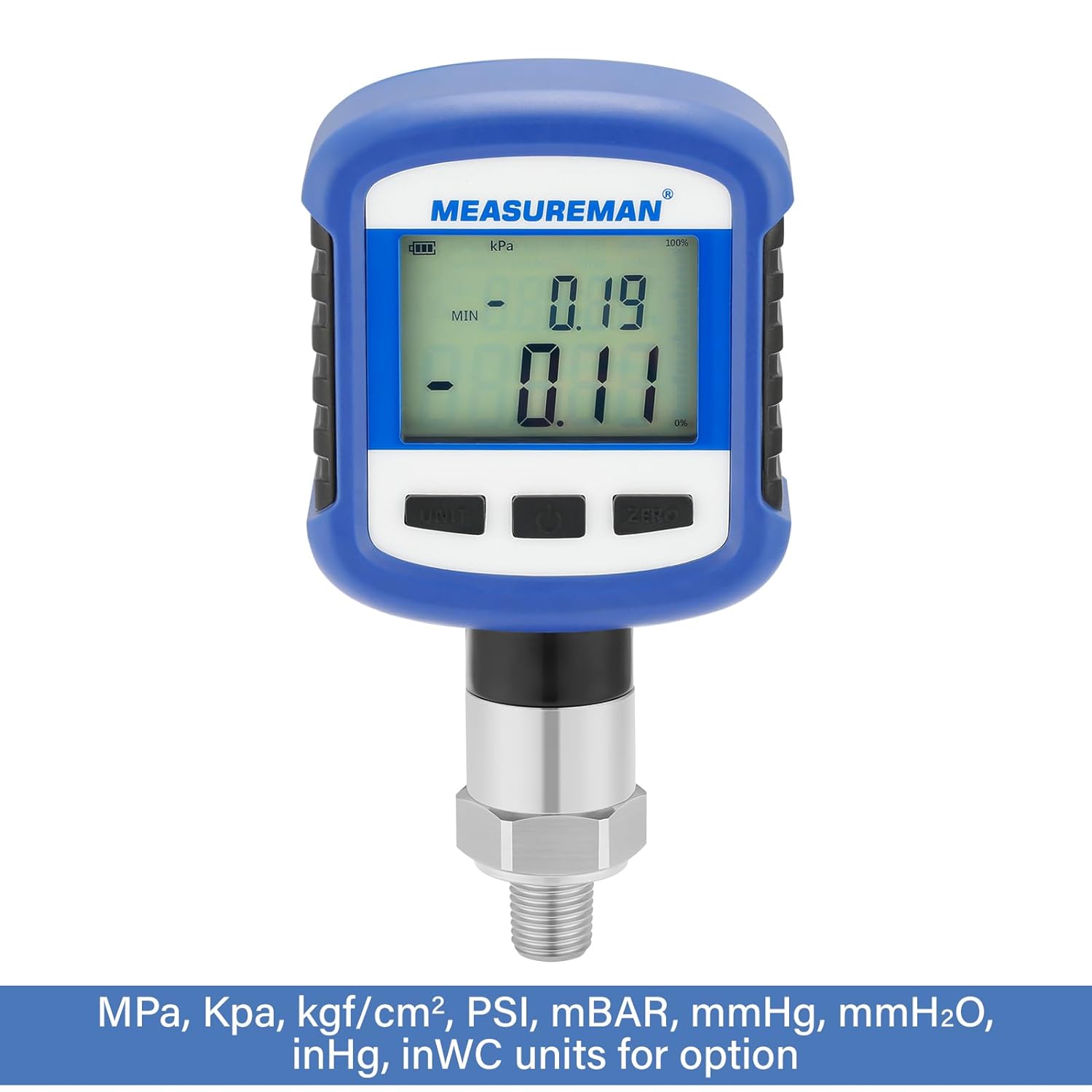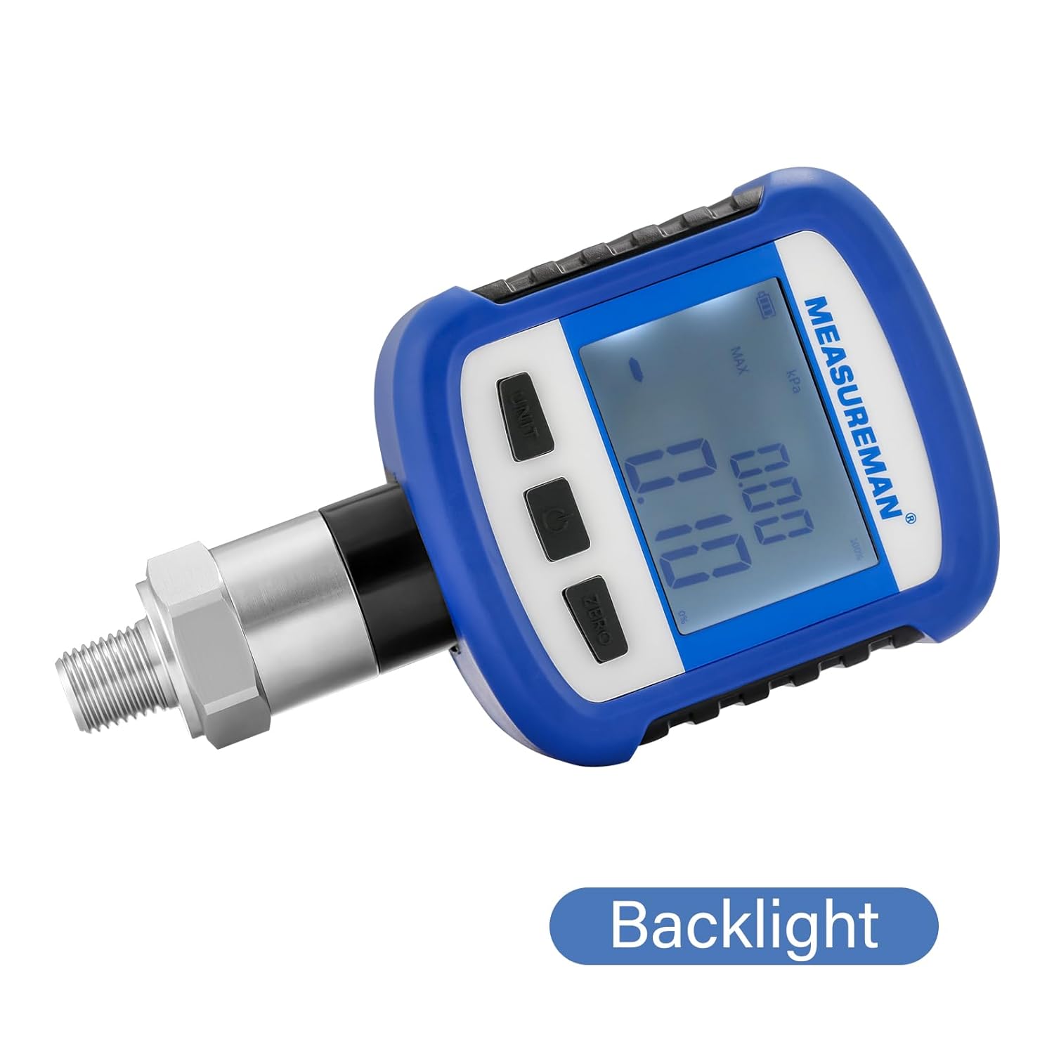 Medidor de presión industrial digital de 0-60 psi, 0.2% FS, NPT de 1/4 pulgadas inferior, caja y conexión de acero inoxidable, alimentado por batería, con Bluetooth y luz LCD