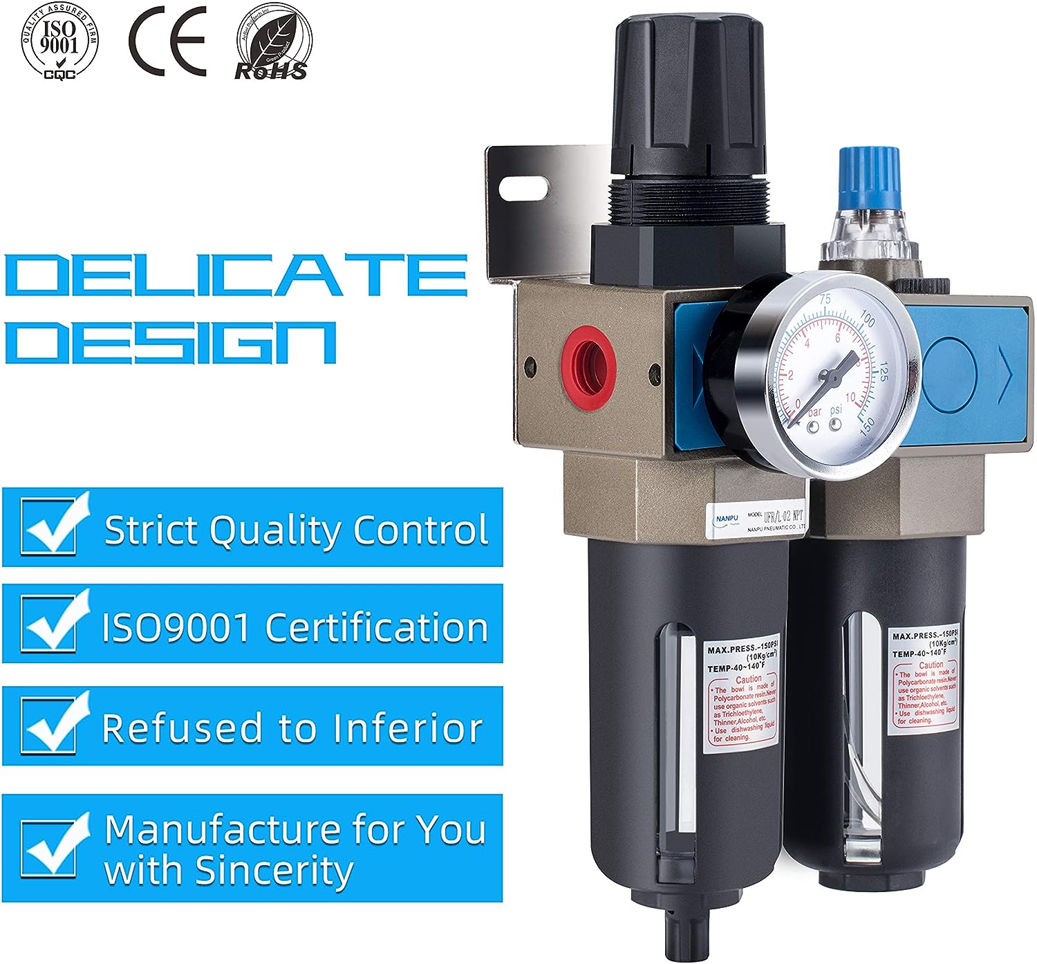 NANPU Lubricador regulador de filtro de aire comprimido NPT de 1/4" (FRL), elemento de latón de 5 micrones, calibre de 0-150 psi, drenaje manual, soporte de metal