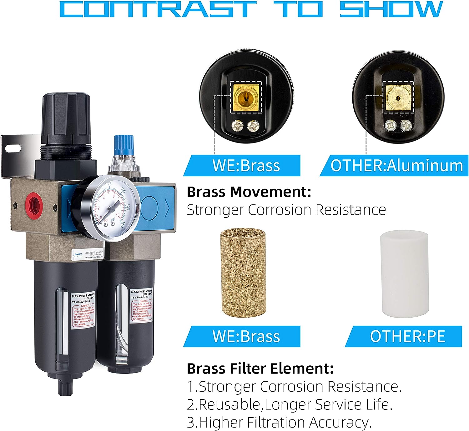 - Incluye drenaje manual y cuenco de policarbonato con protector de plástico, calibre de 0-150 psi y soporte de metal, un par de acopladores de aire de latón NPT de 1/4 de pulgada y kit de enchufe, 2 accesorios NPT de 1/4 pulgadas, 1 cinta de sellado de rosca.