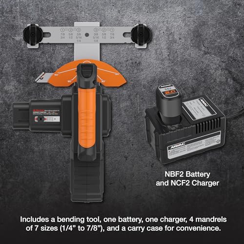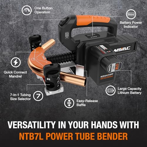 - Potencia y precisión: Equipado con un motor de CC y alimentado a 7.4 voltios, NTB7L es una herramienta poderosa para tubos de gran tamaño. Ángulos de flexión precisos con selector de tamaño 7 en 1 para tubos de cobre blando de 1/4", 5/16", 3/8", 1/2", 5/8", 3/4" y 7/8".