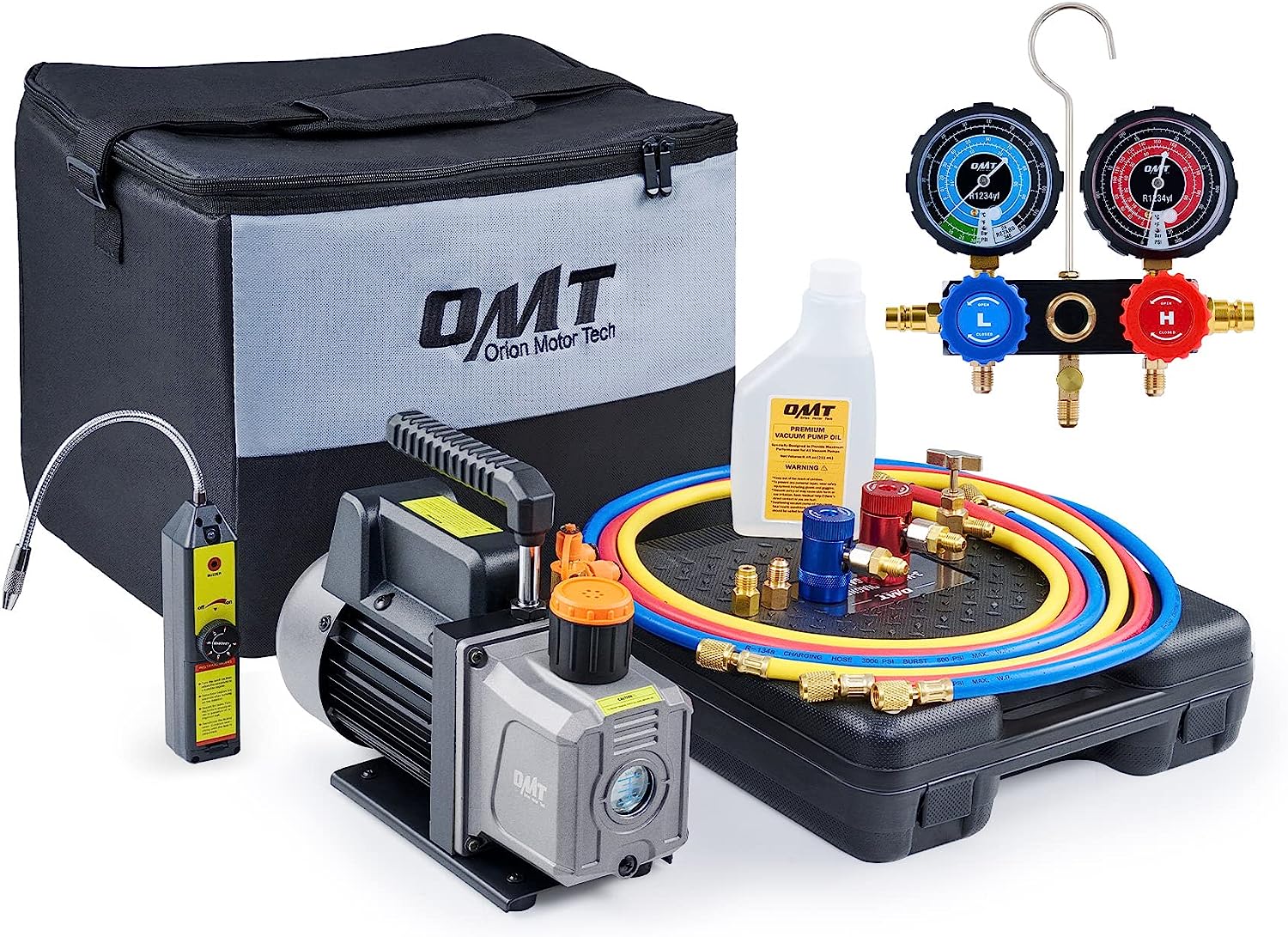 Orion Motor Tech Bomba de Vacío de CA con Manómetros, Bomba de Vacío de 4.5cfm y Juego de Manómetros de Colector de 4 Vías con Detector de Fugas para Refrigerante R134a, R22 o R410a (4.5 CFM&4 Way)