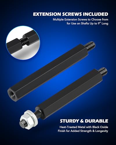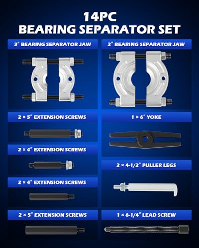 - Kit de herramientas todo en uno: nuestro juego de separadores de rodamientos incluye una mordaza separadora de rodamientos de 3 pulgadas, mordaza separadora de rodamientos de 2 pulgadas, yugo de 6 pulgadas, tornillo de fuerza de 6-1/4 pulgadas, cuatro tornillos de extensión de 4 pulgadas, cuatro tornillos de extensión de 5 pulgadas y dos patas tipo L de 4-1/2 pulgadas