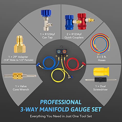 - Amplia aplicación: este medidor de freón funciona con refrigerantes R1234yf, R134a y R404a; ideal para el mantenimiento de HVAC, este kit de recarga de CA R1234yf te permite medir la presión, recarga de CA, evacuar y rellenar refrigerante