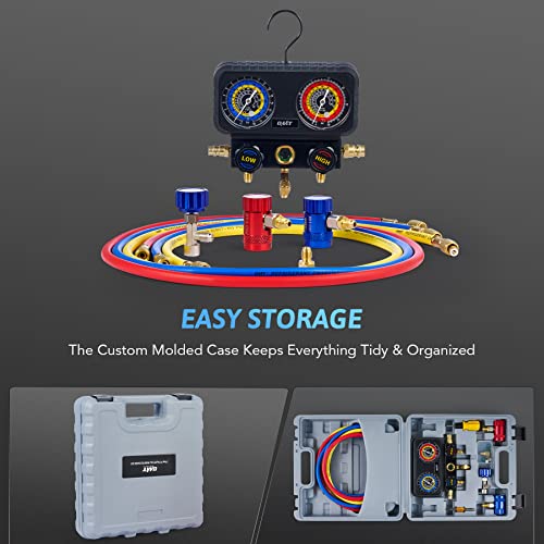 - Medidores de precisión: los medidores de presión alta y baja de este juego de medidores de CA R1234yf combinan las mejores características de diseños secos y llenos de líquido, con un núcleo lleno de aceite resistente al desgaste y a los golpes y una esfera seca que proporciona un mejor rendimiento de invierno; y tornillos de calibración y diseño superior proporcionan una precisión de ±1.6%