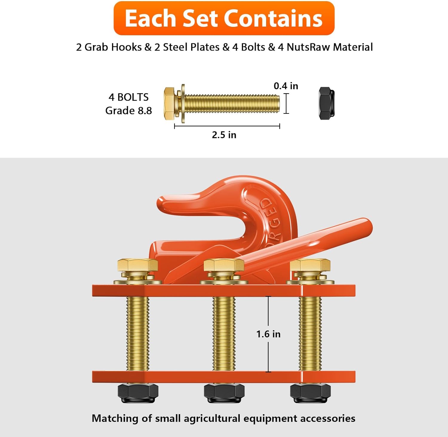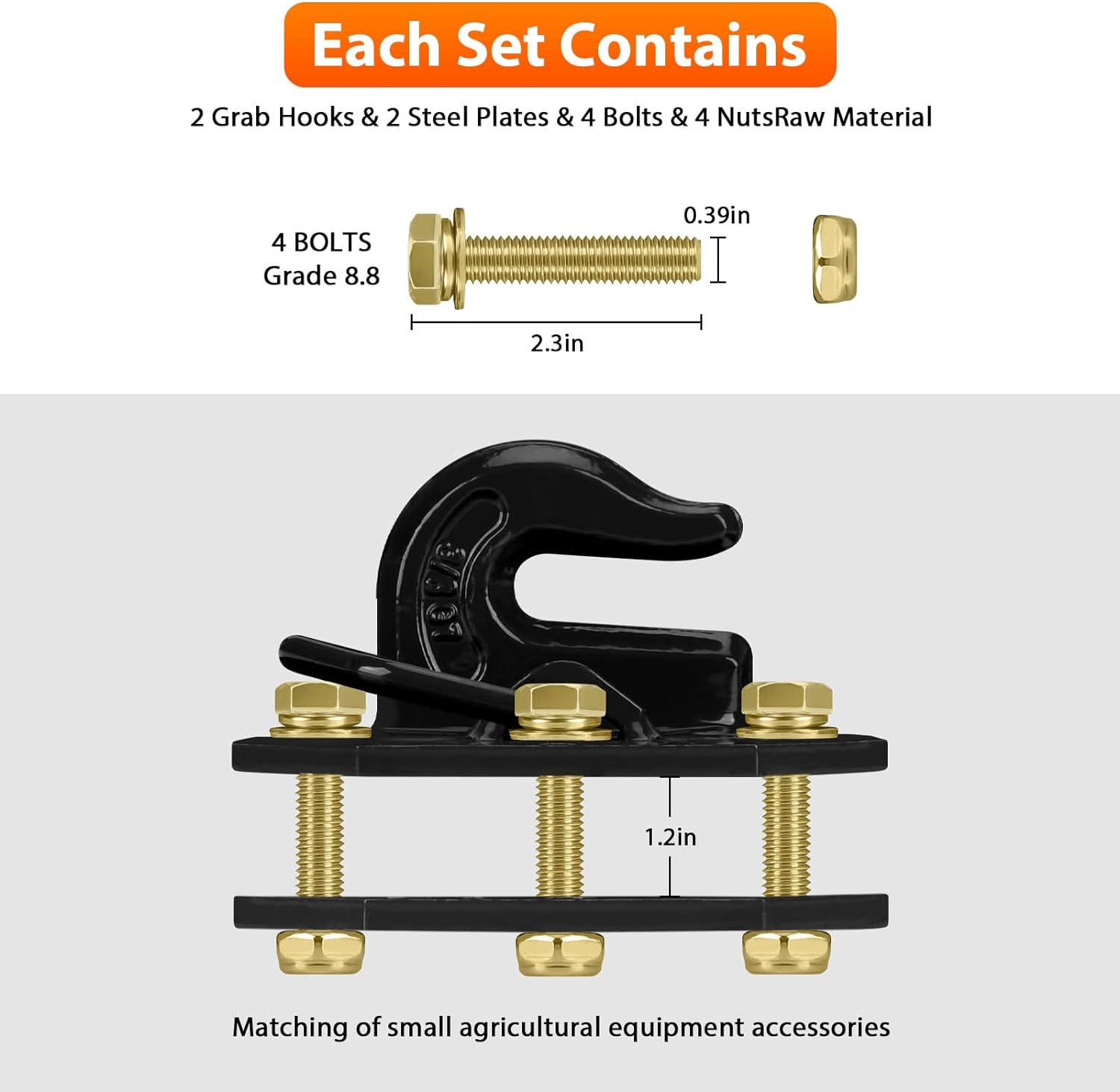 - Ganchos de agarre de cadena y anillos en D: los ganchos de agarre funcionan bien con cuerda, cable, correas o carpetas de cadena o trinquete para asegurar tu carga o para anclajes de remolque. También funciona bien para cubo de tractor, RV, UTV, camión.