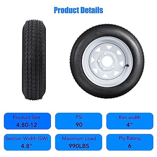 Paquete de 2 neumáticos de remolque 480-12 4.80x12 4.80-12 4.8-12 4.8-12 con llantas de 12 pulgadas, 5 lengüetas en 4.5 pulgadas, rango de carga C 6PR