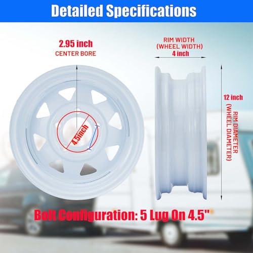 - 4.8-12 Neumático de remolque: Dimensiones de la llanta: 12" diámetro x 4" ancho, Configuración del perno: 5 Lug 4.5"