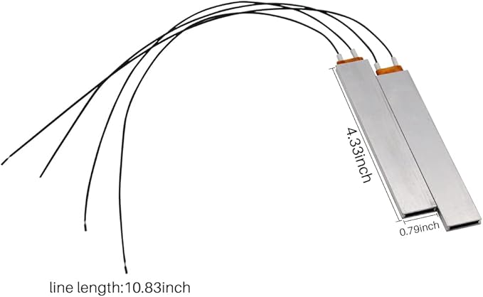 - Especificaciones: Material: aluminio, material de calefacción: Termistores PTC, modo de calefacción: Calor a través del flujo de aire o contacto directo con un objeto, Material de plomo: Alambre de goma de resistencia a altas temperaturas, modo de conexión del cable: Conecte voltaje nominal, independientemente de los polos positivos y negativos, Longitud del cable principal: Aprox. 10.6 pulgadas. Tamaño: aprox. 3.14 x 0.78 pulgadas. Peso: aprox. 2.5 onzas