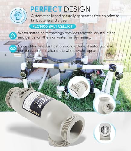 - Diseño perfecto: el kit de células de sal PLC1400 genera automáticamente y naturalmente cloro libre. Utiliza tecnología de ablandamiento de agua para proporcionar agua maravillosamente suave, cristalina y suave en la piel para nadar. Una vez que se realiza el trabajo de purificación del chIorine, se convierte automáticamente de nuevo en sal, para ser utilizado una y otra vez.