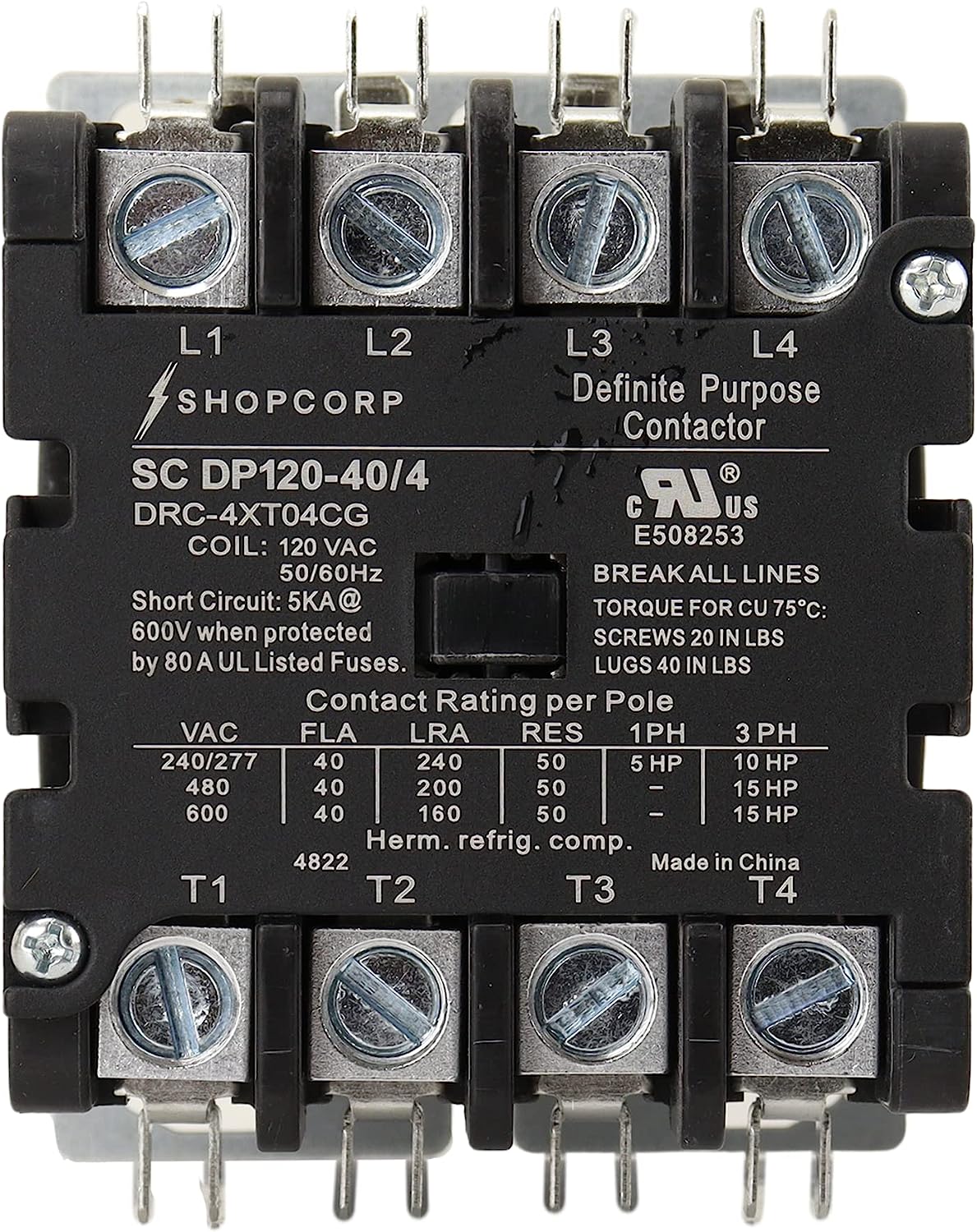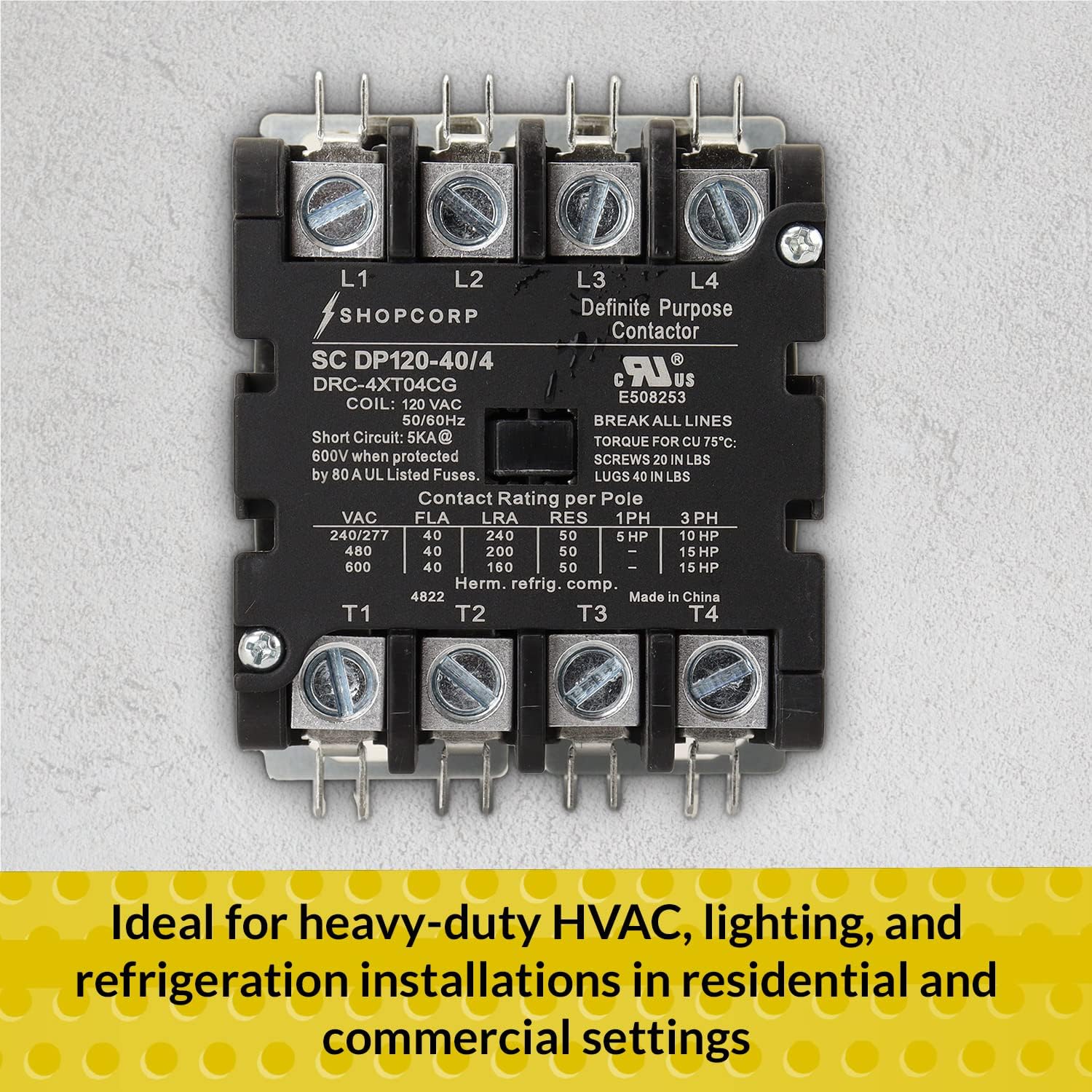 Shopcorp Contactor magnético de propósito definido de 40 A, 4 polos, NO 600 V, HVAC, iluminación y refrigeración, bobina de 110/120 V, carga del motor 40A, aire acondicionado y bomba de calor