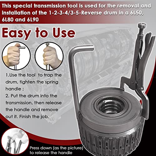 - Una herramienta imprescindible: esta herramienta de transmisión se especializa para quitar e instalar sin esfuerzo el tambor 1-2-3-4/3-5-Reverse en una transmisión 6L50E, 6L80E y 6L90E. No se desliza, sin potencial de daños durante el proceso de extracción e instalación. Obtén la herramienta, haz el trabajo más fácil.