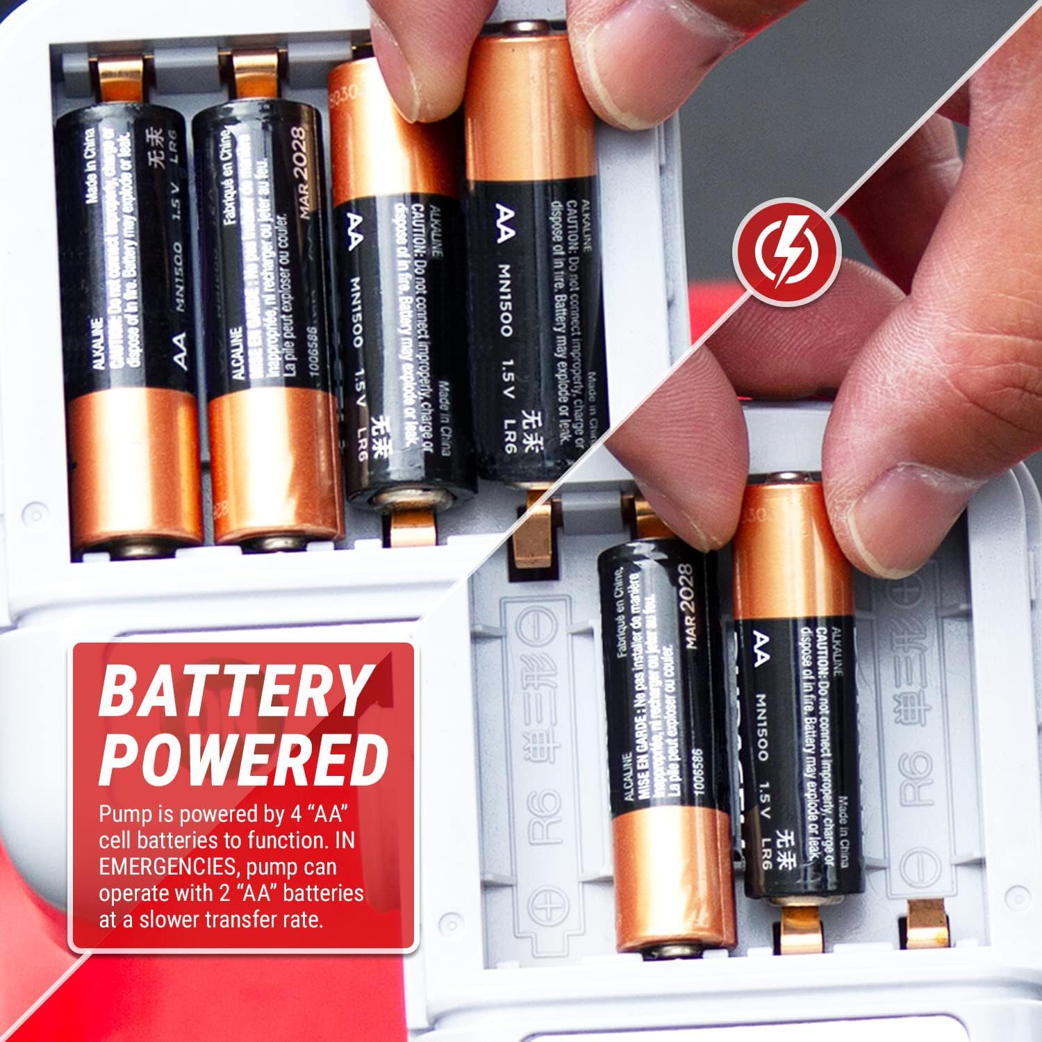 - Velocidad de transferencia rápida: bombea a un ritmo rápido de 2.3 galones por minuto para hasta 250 galones de líquido. Alimentado por cuatro (4) baterías de tamaño AA (se venden por separado) o durante una emergencia, utiliza dos (2) pilas AA en las ranuras centrales para ahorrar energía (a una velocidad lenta de velocidad).