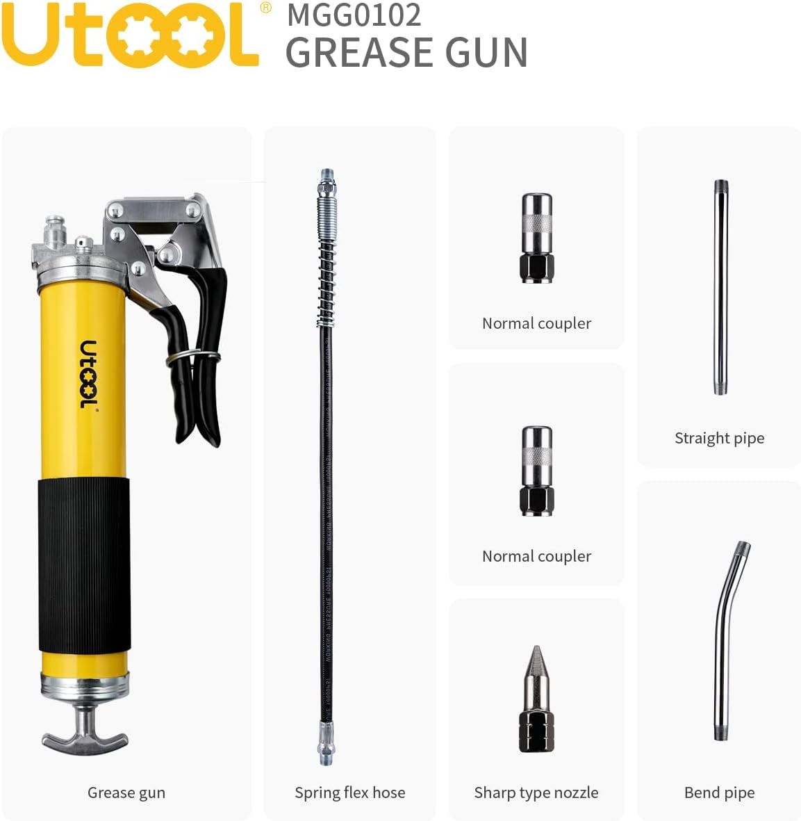 UTOOL - Pistola de engrase, 8000 PSI, kit de pistola de engrasar de alta resistencia con capacidad de 14 onzas, manguera flexible de resina de 18 pulgadas, 2 acopladores básicos, 2 tubos rígidos de